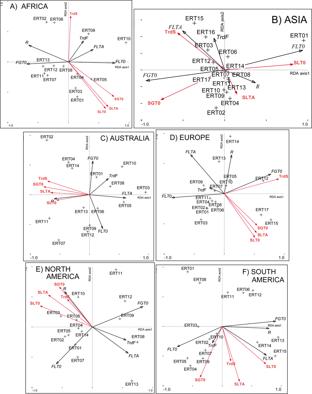 A gradient analysis was run using a Redundancy Analysis (RDA) as in [] to assess how much of the variance in the FPAR3g dataset can be explained by the SPEI12 data. The input for this analysis was a data table for each continent separately with the ERTs as rows and FPAR3g and SPEI12 variables averaged within the ERTs as columns. Results were presented as tri-plots with the ERTs, the FPAR3g variables and the SPEI12 predictors. Based on the position of the ERTs and the FPAR3g variables the indicator value of the metrics for a given ERT can be inferred. Projecting the ERTs perpendicularly onto one of the arrows of the FPAR3g or SPEI12 variables shows the value of the variable in that ERT. The SPEI12 and FPAR3g variables were presented by arrows. Arrows pointing in the same direction in the tri-plot indicate positive correlation of the variables whereas arrows being nearly perpendicular indicate no correlation between the variables.