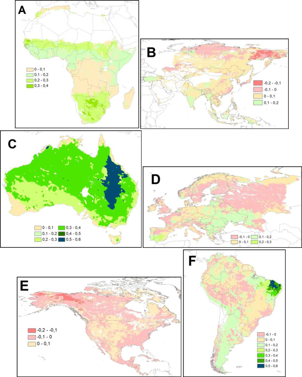 Figure 1 shows the classified Ecosystem Response Types (ERTs) per continent. All SPEI12 and FPAR3g correlations, anomalies and trends of the ERTs were significantly different (p < 0.001) for all continents indicating the unique information contents of all ERTs. Overall highest explanatory values of the ERTs were seen in Australia, Europe and South America (Table 1, adjusted R2) whereas least amount of variance in the SPEI12 and FPAR3g variables was explained by the ERTs in Asia. Globally, the variances in the SPEI12-FPAR3g correlations and in the FPAR3g trends were explained the best by the ERTs whereas weakest explanatory power was seen for long term average FPAR3g anomalies and for SPEI12 trends.