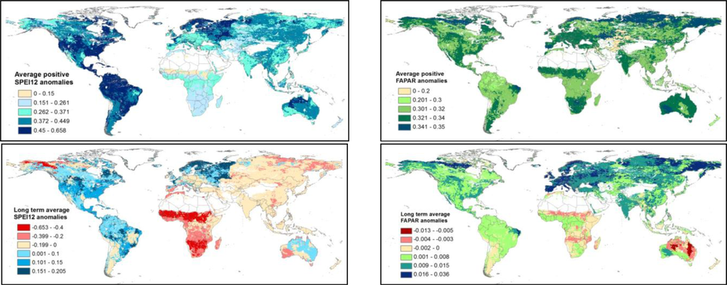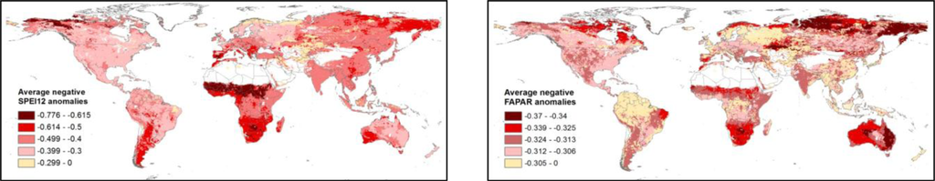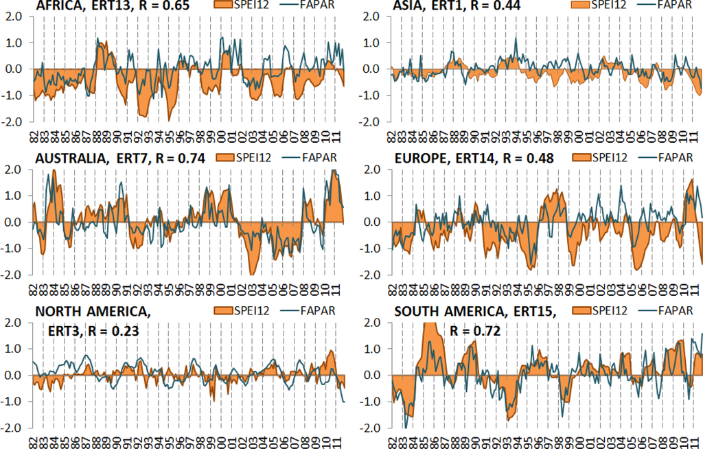 In the Sahel region, for instance, the most severe droughts occurred in the 80s but greening trends were observed in the last decades. Our study showed that these greening trends are associated with positive trends in the SPEI12 in line with [] showing increases in daily rainfall intensity over these areas. The same authors projected an overall wetter Sahel with more variable precipitation on all time scales; thus, in the future, if these trends follow the observed pattern, these areas might be less at risk of losing productivity due to droughts. North-east of Brazil showed globally one of the strongest correlations between FPAR3g and SPEI12 and also here trends in both SPEI12 and FPAR3g anomalies were positive. In 2013, however, after the observation period of this study, north-eastern Brazil suffered its worst drought in the last 50 years.
