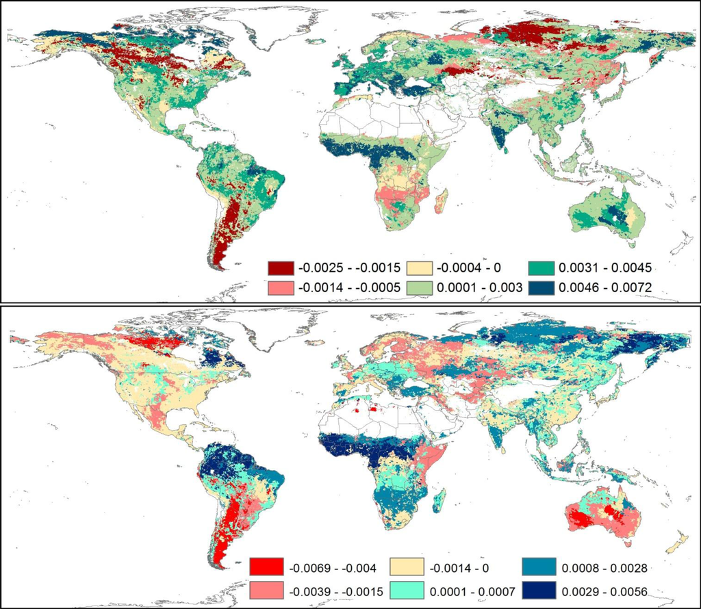 For ERTs shown in yellow and orange tones, the correlation between SPEI12 and FPAR3g anomalies is also due to droughts (positive correlation between mostly negative anomalies) but in these ERTs the severity of the drought events decreased over the last 30 years (positive SPEI12 trends). These ERTs are mostly found in Asia (India, China and Indochina Peninsula), the Mediterranean and south-east areas of Europe, most parts of Africa, northern Australia and northern parts of Latin America.