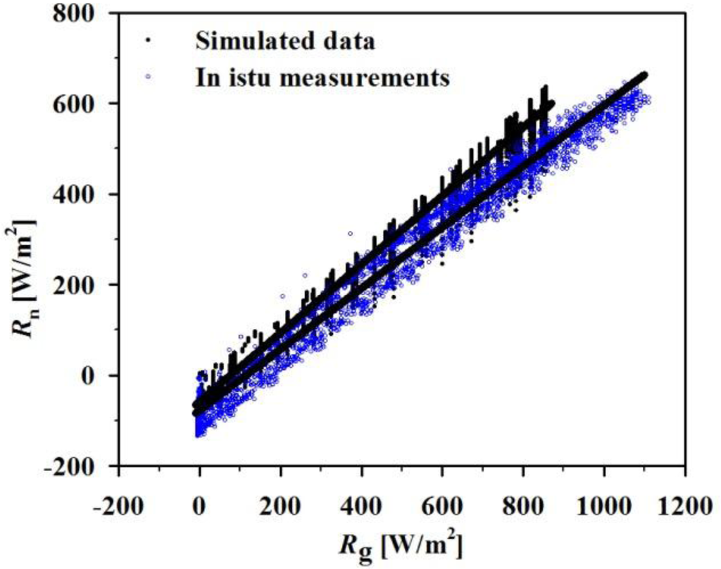 Incoming solar radiation (Rg) is the main driving source of surface energy [43]. Figure 1 shows the relationships between Rn and Rg based on ALEX-simulated data and in situ measurements. It can be inferred that Rn is generally positively proportional to Rg with a coefficient of determination (R2) larger than 0.98. Therefore, ΔRn in Equation (7) can be further replaced by ΔRg but with different coefficients.
