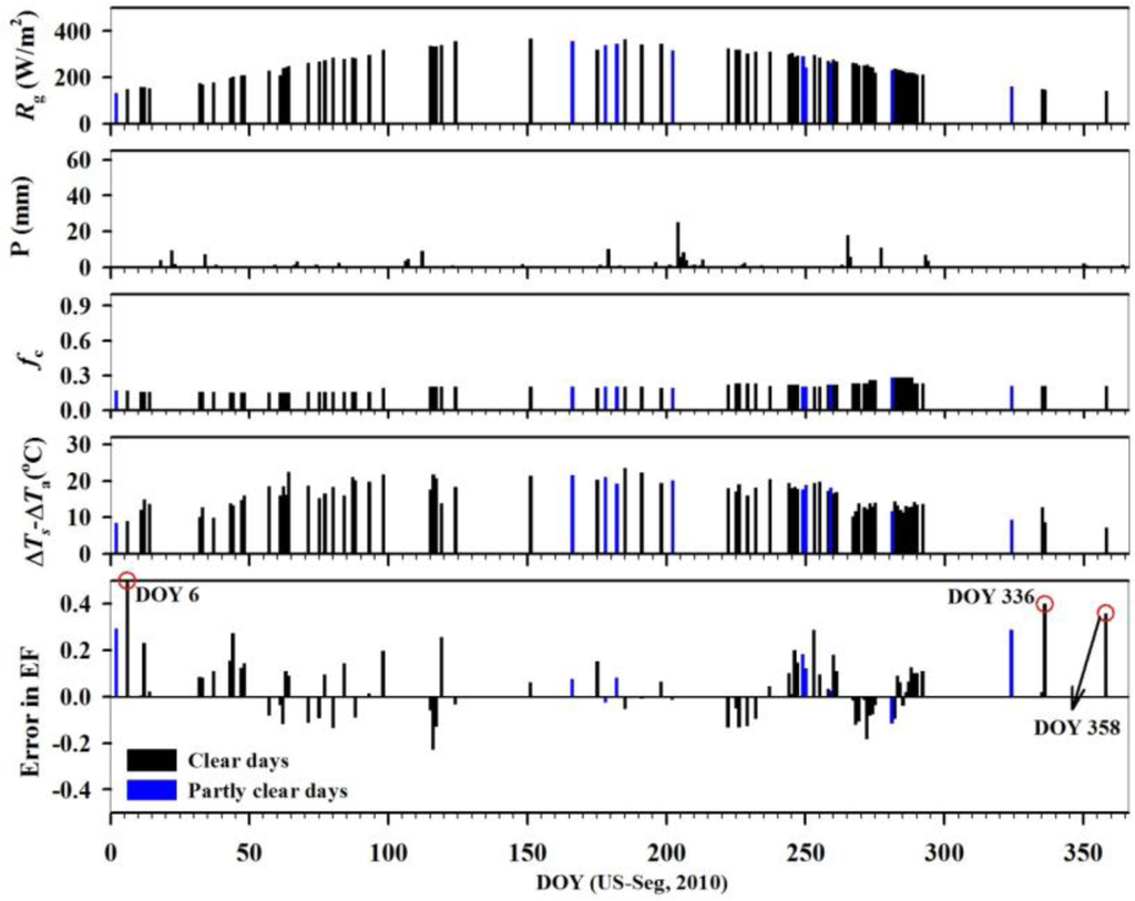 At the US-Seg station covered by GRA vegetation type, the climate is semi-arid, and the annual precipitation of the region is ∼230 mm, with a major portion (>50%) occurring in a summer rainy season, July to September [55]. In 2010, the total precipitation was only 182 mm (see Table 2). Therefore, EF from measurements at the US-Seg station was generally low, even less than 0.6 (see Figure 8b). Most of the EF estimates from Equation (8) generally fall into this range but with a slight overestimation. According to Equation (8), the underestimation in fc would lead to an overestimation in EF. Therefore, low fc of ∼0.2 in 2010 (may be underestimated) results in the overestimation of EF at the US-Seg station. On DOY 6, 336, and 358, larger errors may be caused by low solar radiation in winter (see Figure 10). The relatively concentrated distribution of daily EF at the US-Seg station in 2010, approximately from 0.2 to 0.6, may lead to the low R2 of 0.148 in Figure 8b.