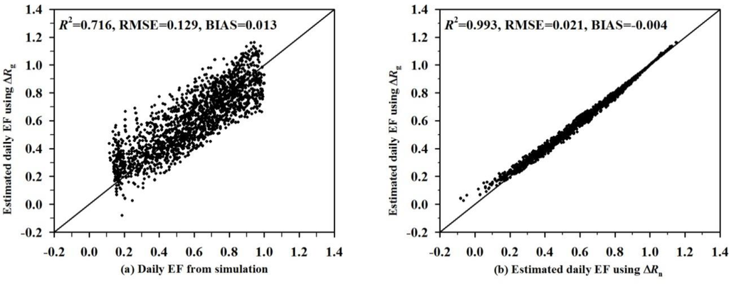 Lu et al. (2013) [38] developed a method for estimating daily evaporative fraction (EF) derived by day–night differences in surface temperature (Ts), air temperature (Ta), and net radiation (Rn). Because incoming solar radiation (Rg) can be readily estimated from remotely sensed data and there is a strong relationship between Rg and Rn, this study simplified the equation for estimating daily EF using Rg. The accuracy of the simplified EF parameterization scheme with ΔRg as an input is nearly equivalent to that with ΔRn as an input.