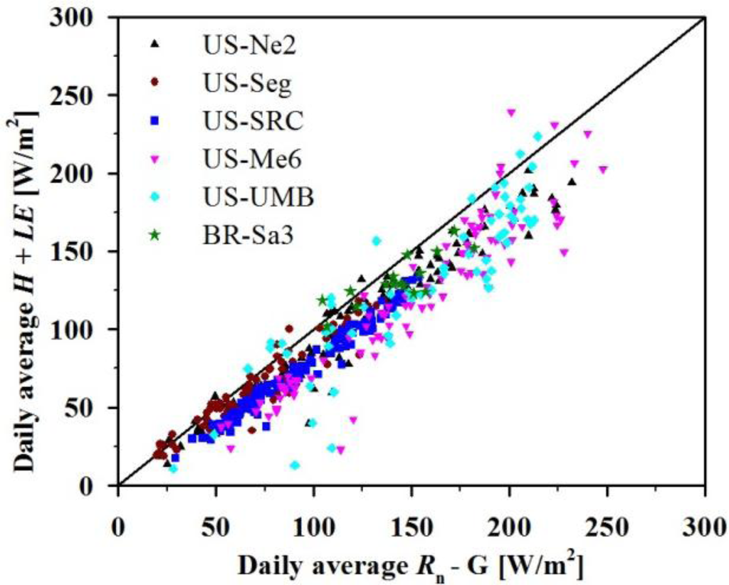 The energy balance non-closure in EC-based measurements was frequently reported in many previous studies [49]. As shown in Figure 5, daily average H + LE are all less than daily average Rn − G for clear and partly clear skies at the six sites. The mean energy balance ratio (EBR) is ∼0.83, and the RMSE is ∼25 W/m2. For each site, the daily-scale statistics of energy balance closure of EC-based measurements including EBR, R2, RMSE, and BIAS are listed in Table 3. The most serious energy balance non-closure in EC-based measurements occurs at the US-Me6 station with a mean EBR of 0.78, and the RMSE between H + LE and Rn − G is 35.2 W/m2. At the BR-Sa3 station, the EC-measured daily average H + LE is closer to Rn − G with an EBR of 0.93. In general, the inconsistent source areas between radiation flux (Rn − G) and turbulent flux (H + LE), and neglecting some terms in surface energy balance equation such as storage heat in forest vegetation, the energy due to photosynthesis and advection, may be the main reasons for non-closure in the energy balance from EC-based measurements.