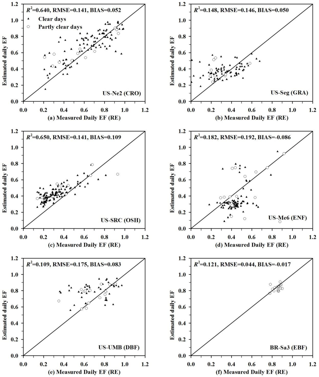 Because remote sensing observations represent a snapshot in time, it is not easy to judge whether an entire day is clear using remotely sensed data. Therefore, the performance of EF parameterization for partly clear days, i.e., no cloud cover during the afternoon here, will also be discussed in this study. For the selection of partly clear days, the automatic procedure for judging clear days is equally applicable but not to regard the monotonic increase from sunrise to midday. A total of 77 partly clear days (marked by open circles in Figure 4) were selected including 12, 10, 10, 15, 14, 16 partly clear days at the US-Ne2 station, at the US-Seg station, at the US-SRC station, at the US-Me6 station, at the US-UMB station, and at the BR-Sa3 station, respectively.