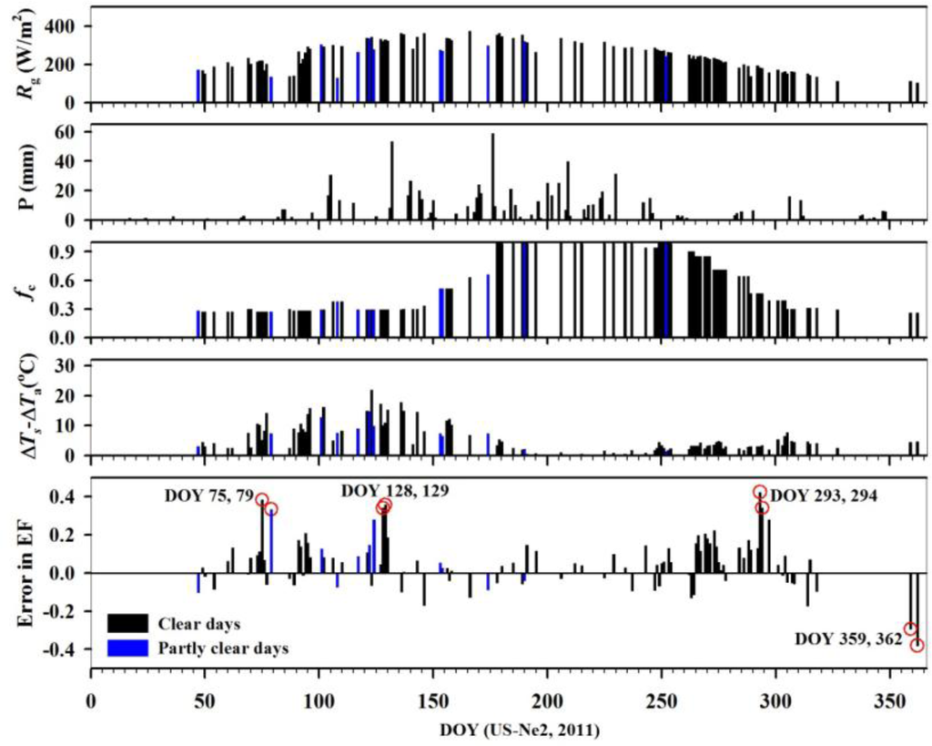For the surface covered by CRO vegetation types, which is at the US-Ne2 station, a majority of the EF estimates are satisfied (see Figure 8a), and the errors vary from −0.2 to 0.2 (see Figure 9). Several large errors (>0.3) for EF estimates occur on DOY 75, 79, 128, 129, 293, 294, 359, and 362 (marked by red circles in Figure 9). The overestimation on DOY 75 may be mainly caused by the small value of ΔTs − ΔTa, which is mostly from measurement errors or is influenced by high wind speed (wind speed in the afternoon at approximately 13:30 on DOY 75 is ∼9 m/s). The error on DOY 79 could be attributed to the effect of clouds, and obvious low averaged Rg was observed on the day. The overestimation on DOY 128, 129, 293, and 294 may be due to the underestimation in fc. On DOY 359 and 362, low Rg that occurred in winter may be the main reason leading to the negative biases of EF estimates. This is because under the condition of low solar radiation, the implicit assumption of relatively invariant EF in Equation (8) is not well met. In general, under the condition of strong solar radiation, sufficient soil water content, dense vegetation cover, and low ΔTs − ΔTa, errors in EF estimates are relatively small.