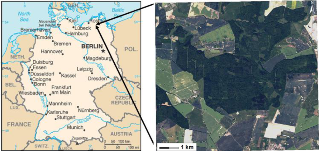 Mixed forest areas in the German state Mecklenburg–Vorpommern close to Schuenhagen (54°15′N, 12°50′E) were selected as a test site for this study, covering approx. 60 km2. The selection was based on the requirements by the forest department and the availability of detailed reference information on damaged ash. Geographically, the study area belongs to the Baltic coast (Figure 1), with an elevation ranging from 70 to 100 m above sea level. The climate is continental with an average precipitation of around 700 mm per year and a mean annual air temperature of around 8.5 °C, with daily means of 0 °C in January and 18 °C in July. Forests cover approximately 40%, and the rest is used for agriculture (crops and pastures) and settlements.