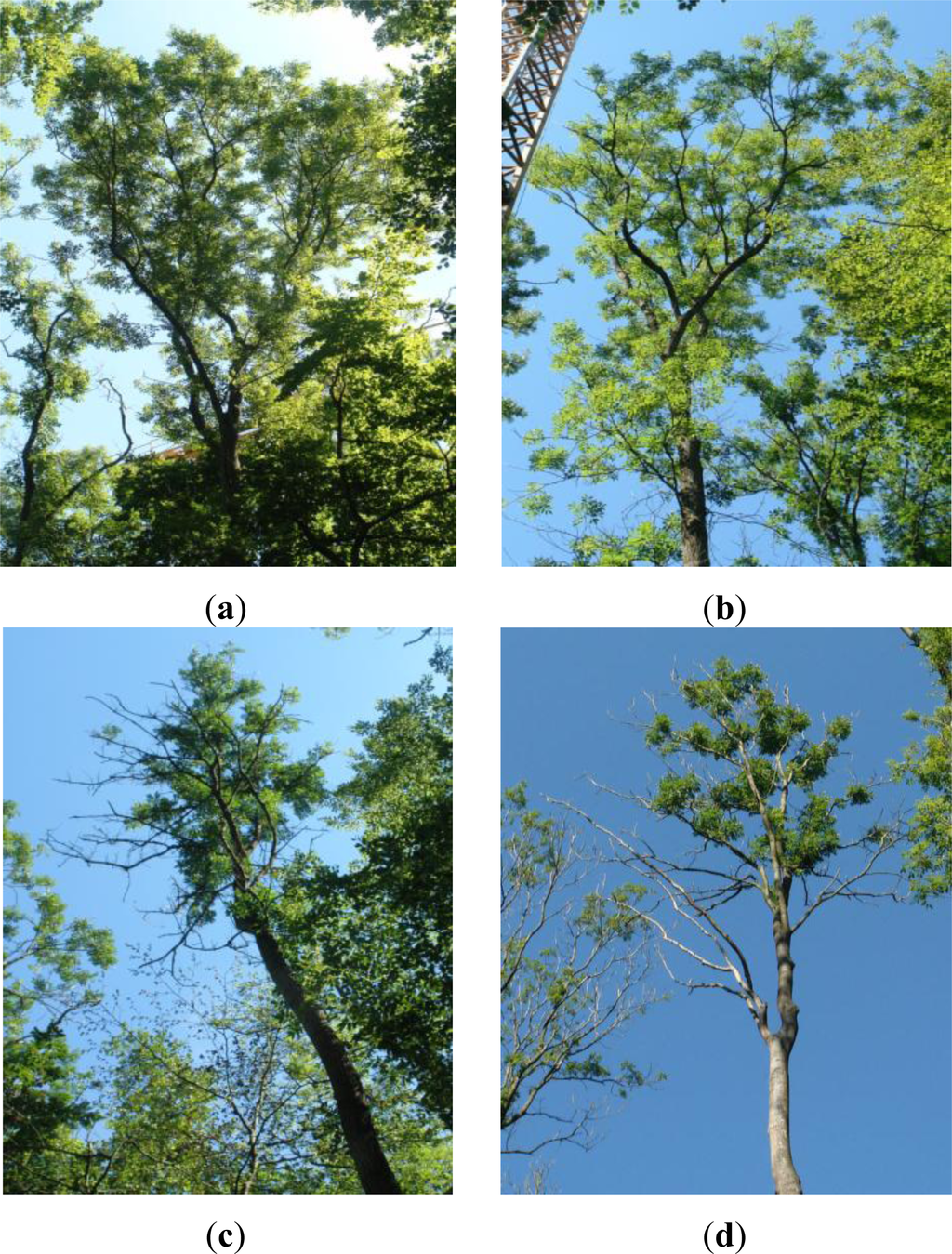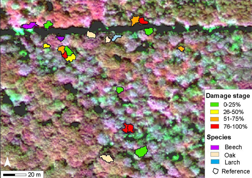- To further improve the distinction between different levels of damaged ash or trees in general, the time gap between the collection of reference data and acquisition of images should be minimized to few weeks. Acquiring multitemporal imagery (e.g., yearly) from other high-resolution spaceborne sensors should also be considered. Another improvement could be to use a continuous approach, i.e., to give the probabilities of a damage level per crown or to predict the decline of foliage on a continuous scale (0–100%). Future work may also include the assessment of biophysical parameters based on image spectroscopy as suggested e.g., in [20,21].