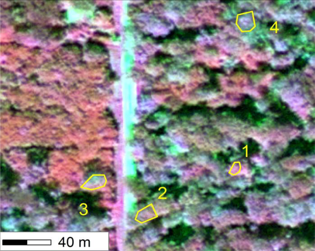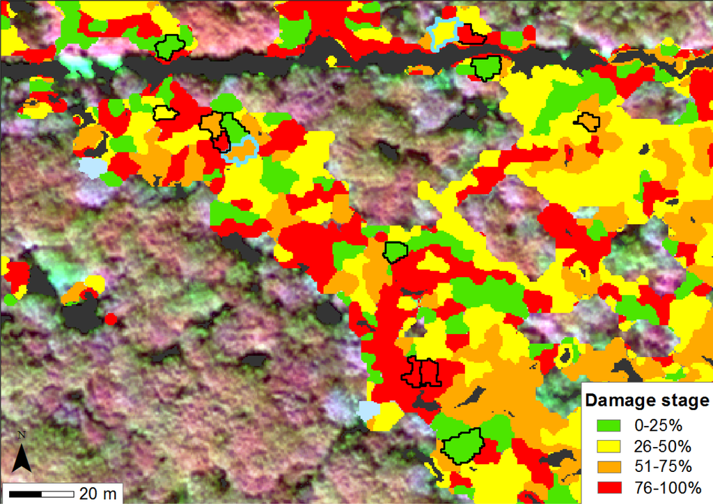 In addition to the tree species map, the predicted damages of ash based on the classification model producing highest overall accuracies (see Table 8) were also visually inspected and compared with the WV-2 orthoimage and also with the corresponding Nikon D300s RGB/CIR aerial images. The inspections confirmed that the damage levels 1 (<25% destroyed foliage), also 3 (50%–<75%) and 4 (75%–100%) are generally well classified when using the LDA of both the image bands and the RSIs as explanatory variables. Problems mainly occur when classifying damage level 2 (25%–<50%), where segments are more often misclassified as damage level 1 and level 3, though less as level 4. Thus, damage level 2 seems to have a higher in-class variance, but also to be rather similar to each other, possibly due to the slight under- or overestimation of the stereo-interpretation of the sampling, as discussed below. Examples of the mapped ash are given in Figure 7.