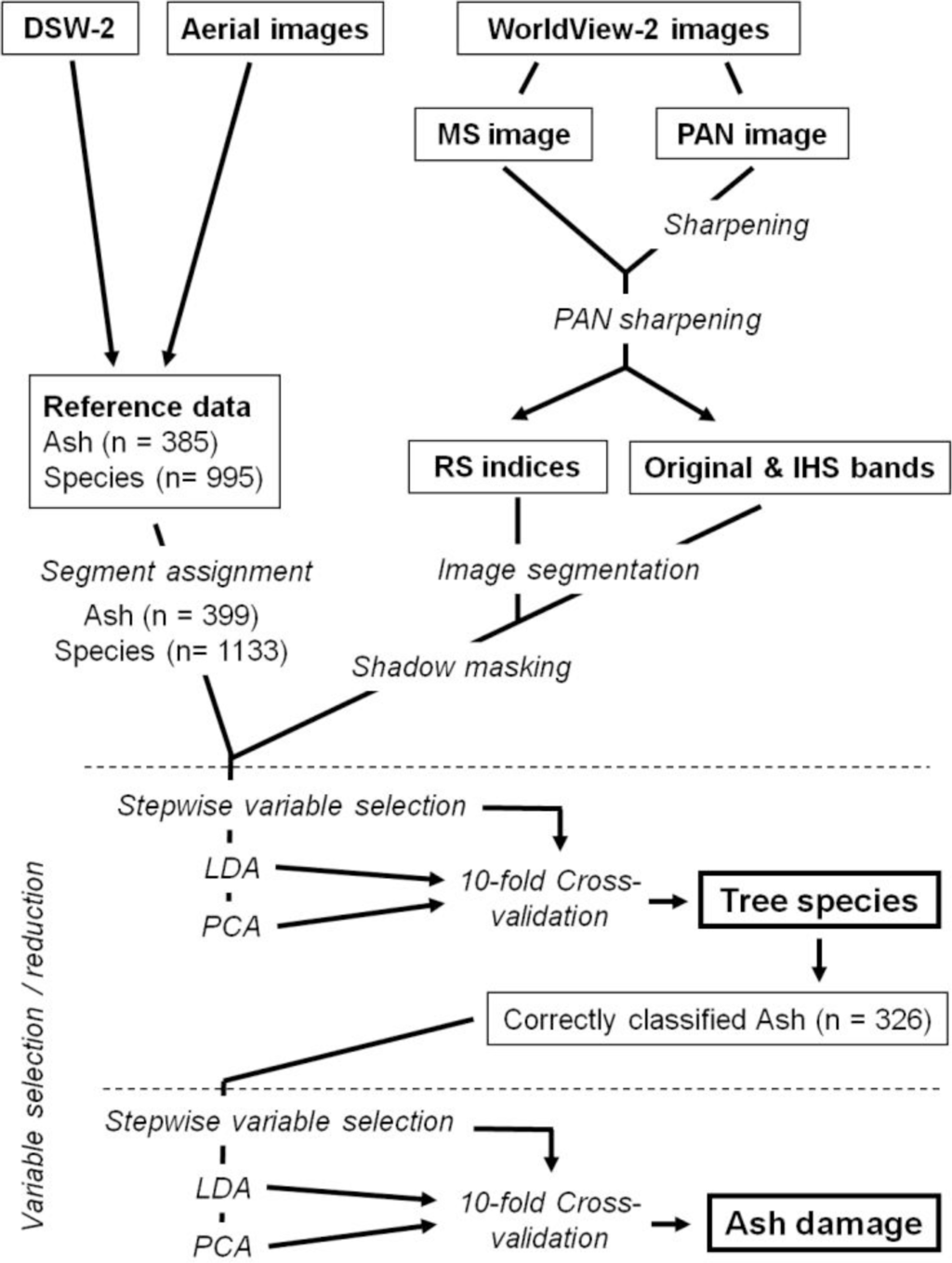 Forest disturbances in central Europe caused by fungal pests may result in widespread tree mortality. To assess the state of health and to detect disturbances of entire forest ecosystems, up-to-date knowledge of the tree species diversity is essential. The German state Mecklenburg–Vorpommern is severely affected by ash (Fraxinus excelsior) dieback caused by the fungal pathogen Hymenoscyphus pseudoalbidus. In this study, species diversity and the magnitude of ash mortality was assessed by classifying seven different tree species and multiple levels of damaged ash. The study is based on a multispectral WorldView-2 (WV-2) scene and uses object-based supervised classification methods based on multinomial logistic regressions. Besides the original multispectral image, a set of remote sensing indices (RSI) was derived, which significantly improved the accuracies of classifying different levels of damaged ash but only slightly improved tree species classification. The large number of features was reduced by three approaches, of which the linear discriminant analysis (LDA) clearly outperformed the more commonly used principal component analysis (PCA) and a stepwise selection method. Promising overall accuracies (83%) for classifying seven tree species and (73%) for classifying four different levels of damaged ash were obtained. Detailed tree damage and tree species maps were visually inspected using aerial images. The results are of high relevance for forest managers to plan appropriate cutting and reforestation measures to decrease ash dieback over entire regions.1. Introduction