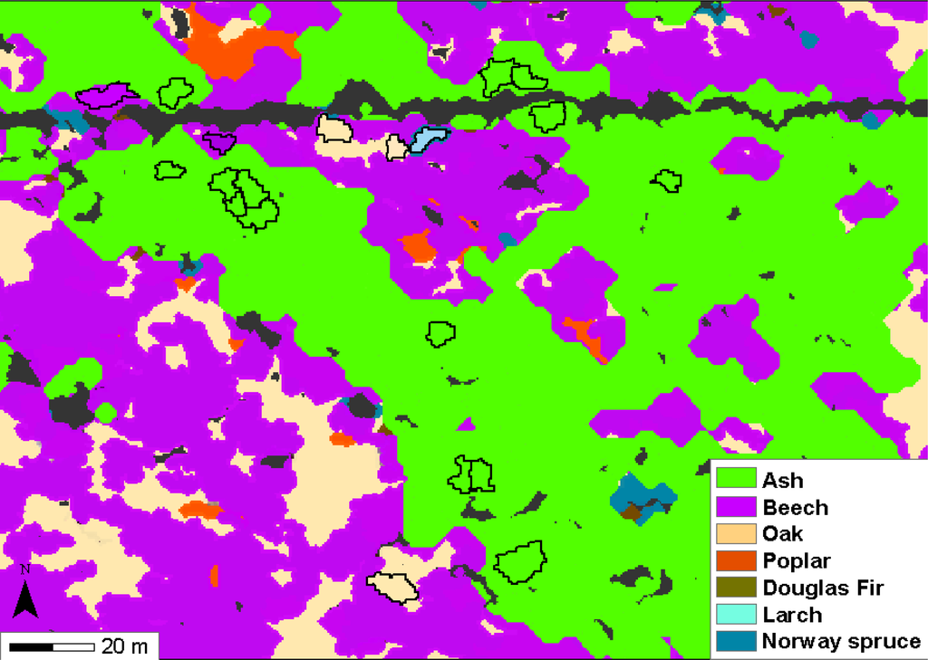 Figure 6 shows the dominance of ash, followed by beech and oak. All reference crown segments were correctly classified. The classification of ash seems reasonable; poplar and larch are also well detected. It seems that few small poplar segments (red) are confused with beech.