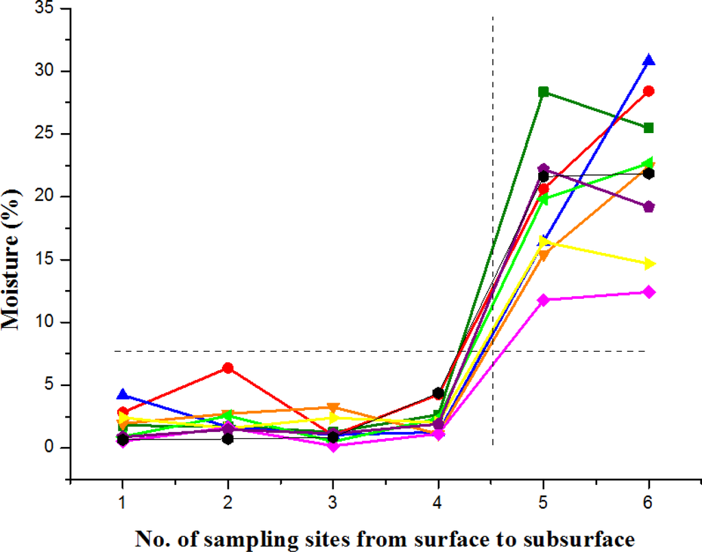 At present, the bed of Lop Nur Lake is extremely flat and uniform, with an endless dry salt crust in all directions. The upper layer of the salt crust is extremely dry with zero water content, resulting in a very low complex dielectric constant (ɛ = 3 − j0.2 for 5.25 GHz, C band, and ɛ = 3.5 − j1 for 1.25 GHz, L band. j means imaginary part of dielectric constant). However, with further digging into the lacustrine deposits, a moist layer was found beneath the upper dry layer on all sampling sites; moreover, at some of the sampling sites, brine was clearly visible and even gushed out. In general, brine is visible at depths of 50–60 cm. Figure 2 shows that the moisture increased abruptly rather than gradually from the fourth sample (average depth of 40 cm) to the fifth sample (average depth of 50 cm) counting from surface to base in each sampling pit. The locations of the fourth and the fifth samples are not fixed, because every sample site has its specific subsurface condition. The average moisture of the first four samples was approximately 2%, but the moisture of the fifth sample increased to 10% at least. From the center to the edge of the lake, the variation of moisture in lacustrine deposits at the same layer position is not obvious.