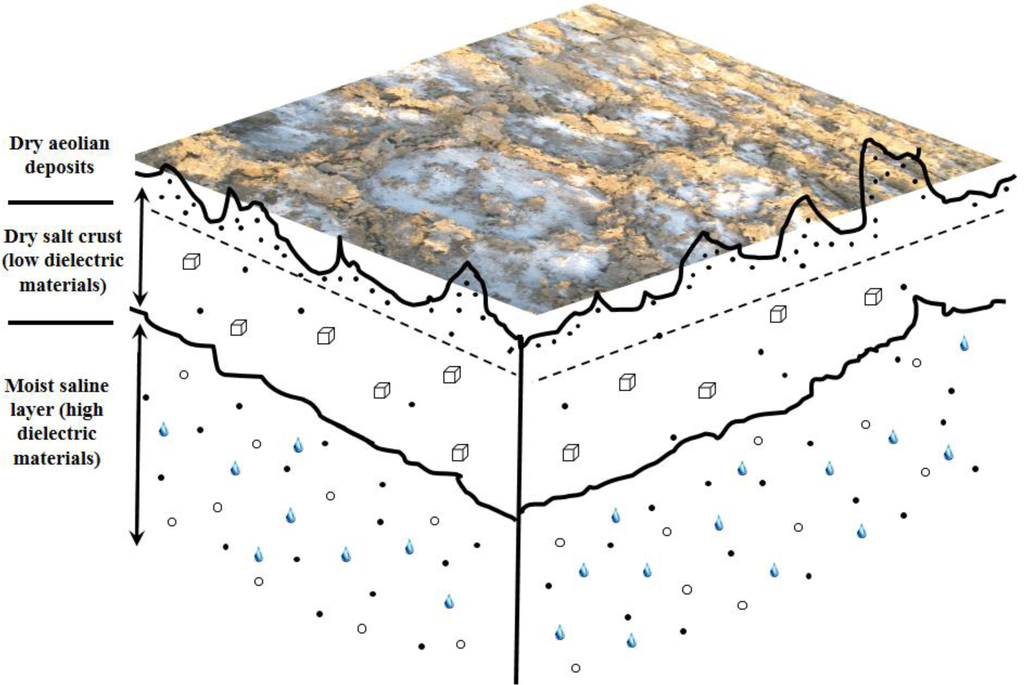 As for subsurface layers of Lop Nur, the SAR signal cannot penetrate further into the moist layer or into brine water because of the strong electromagnetic attenuation caused by the high dielectric media. The subsurface structure of Lop Nur can be regarded as consisting of two layers with different dielectric properties, an upper dry layer and a moist saline subsurface layer [22]. The GPR detected a boundary between the dry upper layer and the wet lower layer at a depth of approximately 50–55cm ranging from the center to the edge of Lop Nur Lake basin. The microwave penetration path through the dry upper layer of loose aeolian deposits and dry salt crusts of low dielectric constant is shown in Figure 3. Microwaves reached the moist saline layer of lacustrine deposits with very high dielectric constant, which acted as a strong reflector and generated a strong signal back to the SAR antenna. This is why the strong backscattering intensity were obtained in Lop Nur Lake basin, and mean values of HH polarization at L and C band extracted from SAR data were −4 dB and −6 dB, respectively.