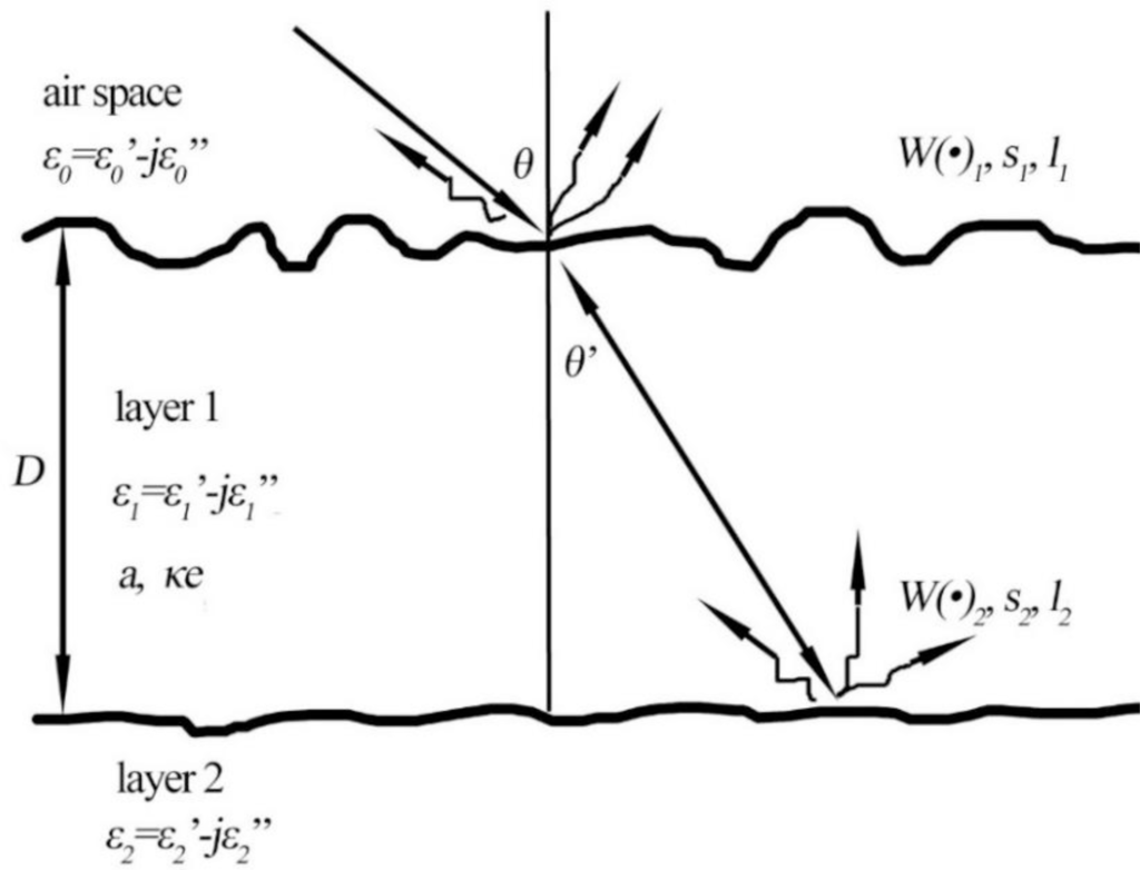 SAR is sensitive to the geometric and dielectric properties of its targets. More specifically, as for surface targets, roughness can represent geometric properties, and its contribution to the final backscattering intensity is usually more important than that of dielectric properties. Generally, most algorithms place particular emphasis on excluding the roughness contribution and retrieving parameters related to dielectric properties such as moisture and salinity [9–13]. In scattering models, surface roughness is difficult to describe, and its scattering process or spectral signature is always a focus of study. After the IEM was proposed by Fung in 1992, several researchers tried to modify it to simulate scattering intensity more accurately by means such as multiscale surface roughness spectral functions, transition models for reflection coefficients, and an absolute phase term to describe multiple scattering contributions [14–19]. In the case of rough surfaces or interfaces, the multiple scattering contributions are no longer small and should not be ignored. In the original IEM, the absolute phase term in Green’s function was eliminated to simplify the mathematical manipulations. The absolute phase term represents downward and upward propagating waves, which should contribute, especially in the case of serious roughness, to the total scattered fields. In recent years, based on a scattering modeling of one interface, a two-layer structure composed of two homogeneous media with two interfaces has become a hot topic. Pinel proposed a two-layer scattering model under the geometric optics approximation which describes scattering mechanisms in detail and simulates scattering behavior for some geoscience applications [20,21].