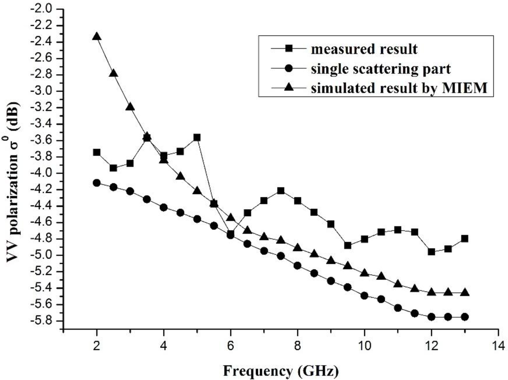 To prove the importance of the multiple scattering part, a standard data set of backscattering coefficients for a rough dielectric surface acquired by EMSL (European Microwave Signature Laboratory) has been used here. This is a Gaussian distributed, Gaussian correlated, and dielectric rough surface. Its RMS height (s) is 2.5 cm, and its correlation length (l) is 6.0 cm. The like- and cross-polarized backscattering measurements were obtained in the frequency range of 2–18 GHz, with incidence angles ranging from 10° to 50°. Figure 5 shows the importance of the multiple scattering part based on MIEM. It has been found that the model including the multiple scattering part can approximate measured data better, especially in the low-frequency band. Actually, the EMSL surface is not extremely rough because its RMS slope under the Gaussian assumption ( ×s/l) is 0.59, which is only a little larger than 0.5. Therefore, the significance of multiple scattering is not clear enough. As for Lop Nur, it is believed that the MIEM can represent scattering behavior at the air-surface interface accurately.