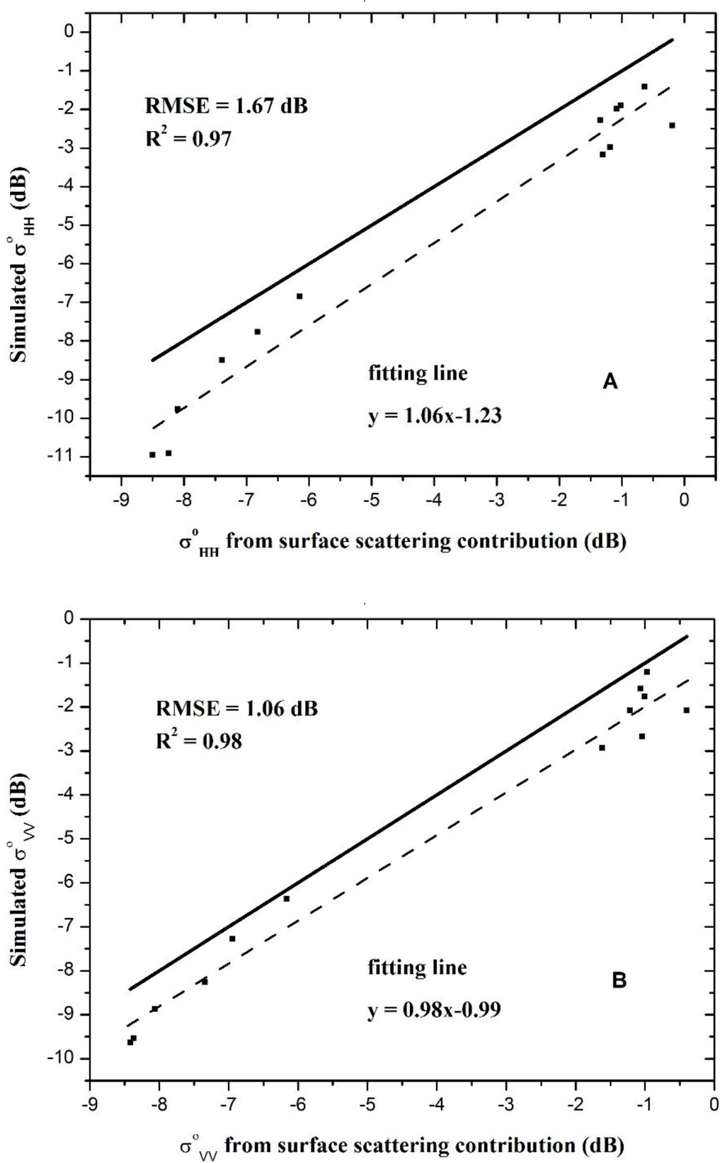 Figure 6 shows a comparison between σ° from the surface scattering contribution using eigenvector-eigenvalue based decomposition and simulated results using the two-layer scattering model. Two scenes of ALOS-PALSAR polarimetric data (L-band, quad-polarization, 23.9° and 25.6° incidence angles for 19 April and 6 May 2009) were used. The input parameters used in these simulations are listed in Table 1. It was found that the two-layer scattering model could represent the surface scattering contribution in Lop Nur, with RMSE values for HH and VV polarization of 1.67 dB and 1.06 dB, respectively. By comparing the solid and dashed lines in each diagram (Figure 6), it is apparent that the simulated results are smaller than the SAR response as a whole. This may be due to a mismatch between the selected window size for polarimetric decomposition and target’s scattering constitution, resulting in confusion of the scattering mechanisms in a resolution cell, or due to the noise level of the SAR system. Nevertheless, the relatively good consistency still shows the applicability of the model.