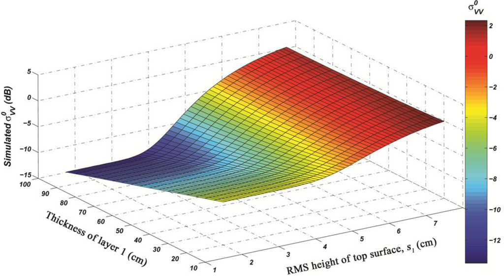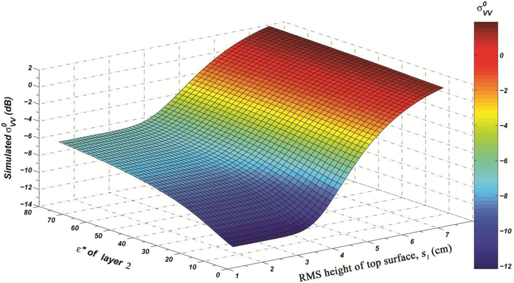 Among the parameters in the two-layer scattering model, the dielectric properties of layer 1 and the roughness condition of the bottom interface are relatively stable in Lop Nur, and therefore the RMS height at the top surface, the ɛ″ value of layer 2, and the thickness of layer 1 will be considered in parametric analysis. Through 3-D graphic effects, the variation patterns of simulated σ°VV from the two-layer scattering model with RMS height of top surface (s1) and ɛ″ of layer 2 are shown in Figure 7. It has been confirmed that with the increase in s1, the simulated σ°VV values increase drastically. Moreover, different ɛ″ values for layer 2 produce almost the same σ°VV over a large s1 range. Only when s1 is small ɛ″bottom have a relatively deterministic effect on σ°VV. In summary, RMS height of surface should be a major factor in the two-layer scattering model compared with ɛ″ of layer 2. Furthermore, when ɛ” of layer 2 increase, the overall level of simulated σ°VV gets higher, which means the dielectric properties of layer 2 create strong backscattering intensity as a background.