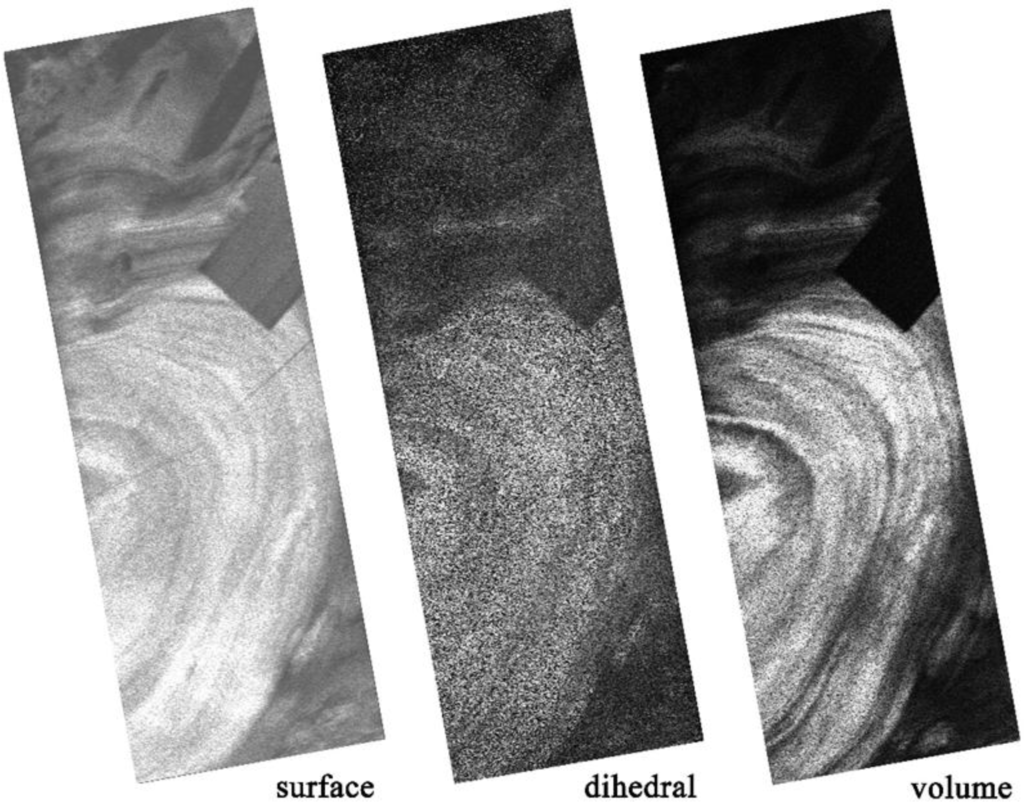 Furthermore, in accordance with scattering mechanisms, to conduct analysis of scattering contributions to the “Ear” feature, model-based decomposition was used to separate the backscattering intensity into several pure scatterings. Such an approach is to use physical models of typical scatters to determine the number and parameterization of each component, and the contribution of each kind of scattering could be obtained [28–32]. Yamaguchi developed a four-component decomposition, which included non-symmetric features to consider more general volume scattering terms, allowing for a relaxation of the azimuthal symmetry assumption to reflection symmetry [33]. Figure 9 shows the Yamaguchi decomposition results in surface scattering, dihedral scattering and volume scattering. The variance of the clarity for the “Ear” feature can be seen from these three images. According to the analysis of scattering mechanism, surface scattering should consist of two parts. One part is generated by the air-surface interface, and the other part arises from subsurface interfaces between media with different dielectric properties. Because of the rough surface conditions of Lop Nur, surface scattering at top surface does not have enough dynamic range to express the differences in SAR response between the bright and grey strips with different image textures. In addition, because of the autochthonous characteristics of Lop Nur, the subsurface interface between media with different dielectric properties is relatively smooth. That means the echo from the subsurface interface cannot exactly represent the image texture. Therefore, the representation of the Lop Nur “Ear” on the surface scattering image was not obvious.