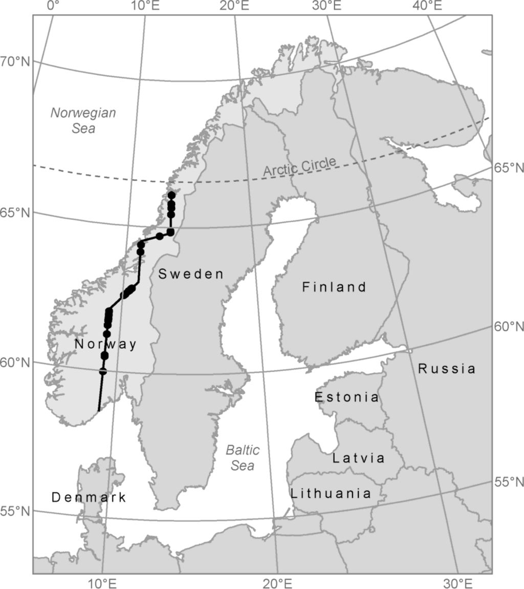 The study area covered a 1000 km long and approximately 180 m wide longitudinal transect encompassing hundreds of mountain forest and alpine elevation gradients. The transect stretches from Mo i Rana in northern Norway (66°19′N 14°9′E) to Tvedestrand in the southern part of the country (58°3′N 9°0′E) (Figure 1). Sample plots were established in the forest-tundra ecotone, which is the transition between the mountain forest and the alpine zone. In most of the localities along the transect, the terrain was characterized by rounded forms with occurrences of hummocks, rocks and boulders, but also some steep slopes. The prevalent tree species were Norway spruce (Picea abies (L.) Karst.), Scots pine (Pinus sylvestris L.), and mountain birch (Betula pubescens ssp czerepanovii).