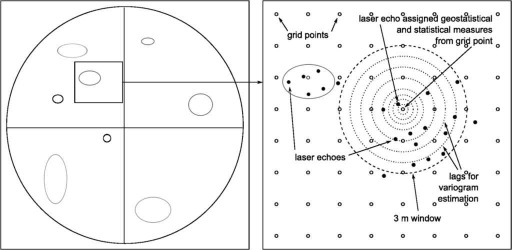 For the computation of the geostatistical and statistical measures, each of the 77 sample plots was overlaid with equally spaced grid points with an interdistance of 1 m. A moving window consisting of a circular buffer with a radius of 3 m was employed to select laser echoes for the estimation of the different geostatistical and statistical measures at each grid point both based on the laser height and intensity values. A radius of 3 m was chosen so that the moving window would be larger than the largest tree crown in the data material. Thereafter, each laser echo was assigned the computed measures of its closest grid point (Figure 2).