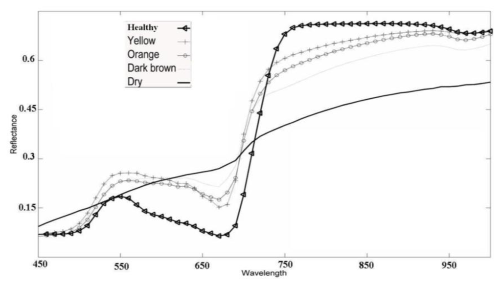 The effect of a disease on the pigments and structure of a plant and the change in their spectral responses enable spectroradiometry and remote sensing techniques to detect plant disease effectively [9].