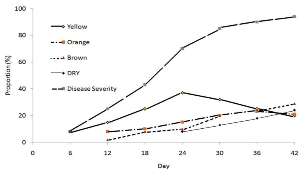 Figure 4 shows the proportions of different disease symptoms and disease severity for a 7-day interval until the 42nd day after inoculation. On the 7th day after inoculation, the proportion of the yellow area is low, but it reaches the maximum value on day 21 (37%). However, the proportion of the yellow area decreases a little after 21 days. The orange and dark brown areas appear on the 14th day after inoculation and show an increasing trend. They reach their maximum values on day 42. The proportions of the orange and dark brown areas on day 42 are 23% and 24% of the leaf area, respectively. The dry area appears 28 days after inoculation and reaches its maximum (18%) on the 42th day. As shown in the Figure 4, disease severity which is the sum of the proportions of different disease symptoms increases with time after inoculation and peaks on day 42.