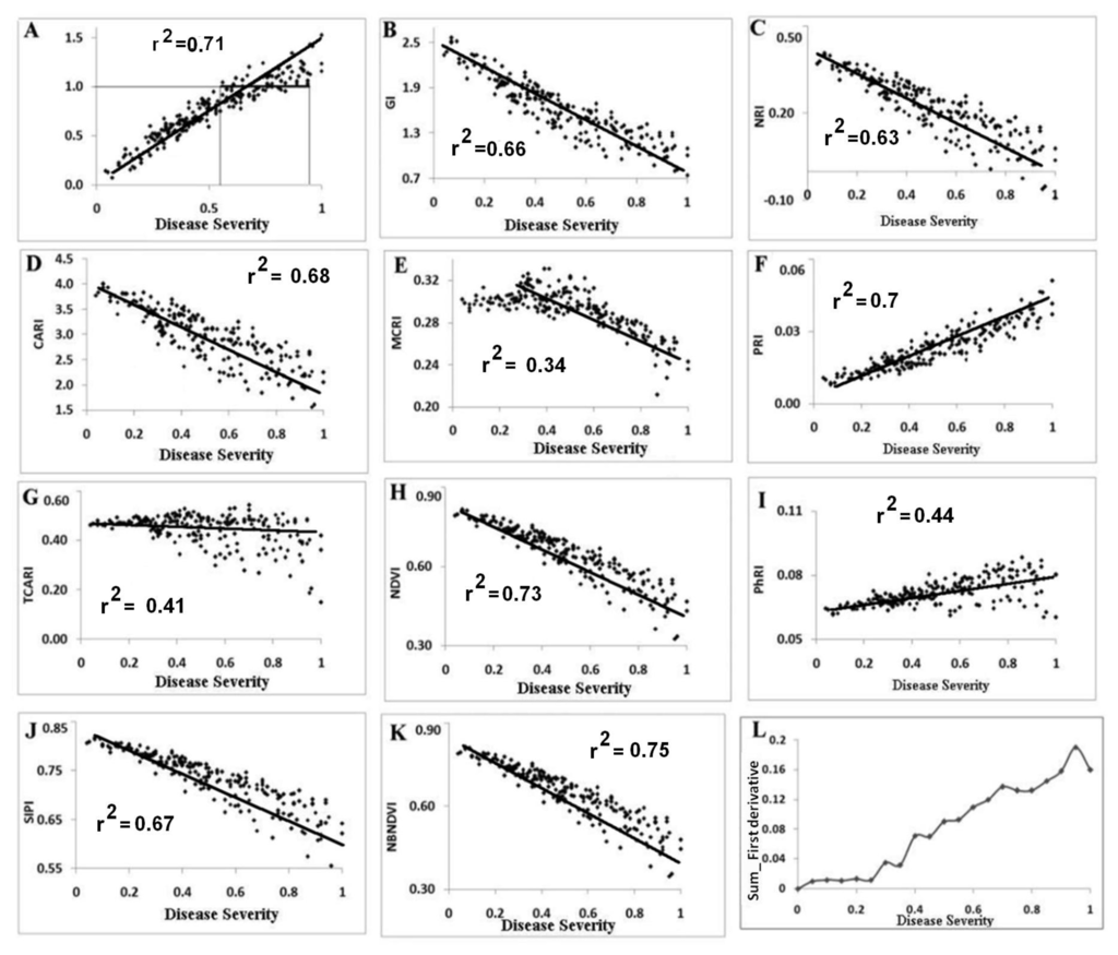 Different coefficients of determination (R2) are observed in the relationship between SVIs and disease severity. The R2 values are shown in Figure 6. NBNDVI (Figure 6K) with the R2 of 0.75, and MCRI (Figure 6E) with the R2 of 0.34 have the strongest and weakest relation with the disease severity respectively.