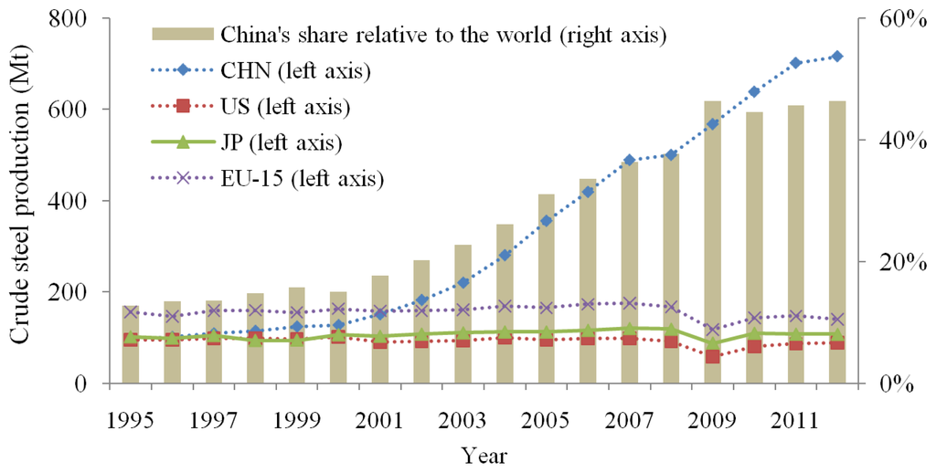 Currently, China is undoubtedly experiencing a phase of rapid urbanization and civil infrastructure construction. Local and central governments are investing heavily in buildings and civil engineering infrastructure, such as highways and railways [1,2]. In this regard, the consumption of steel, the most widely used construction material, is rapidly increasing [3,4]. In 2012, China’s crude steel production (Figure 1) and apparent steel consumption accounted for 46.3% and 45.7% of the world’s total, respectively [5,6]. In particular, in 2013, steel consumption in the Chinese construction sector was projected to reach 56.6% of the total consumption [7]. It is also important to note that as one of the main emitters of CO2, the iron/steel industry in China emitted 1.17 billion tons of CO2 in 2009, which accounted for 50% of the total emission amount of the steel industry worldwide [8]. In this light, it is essential to realize sustainable resource management for steel from the viewpoint of achieving environmental protection and a low-carbon society in rapidly urbanizing China.