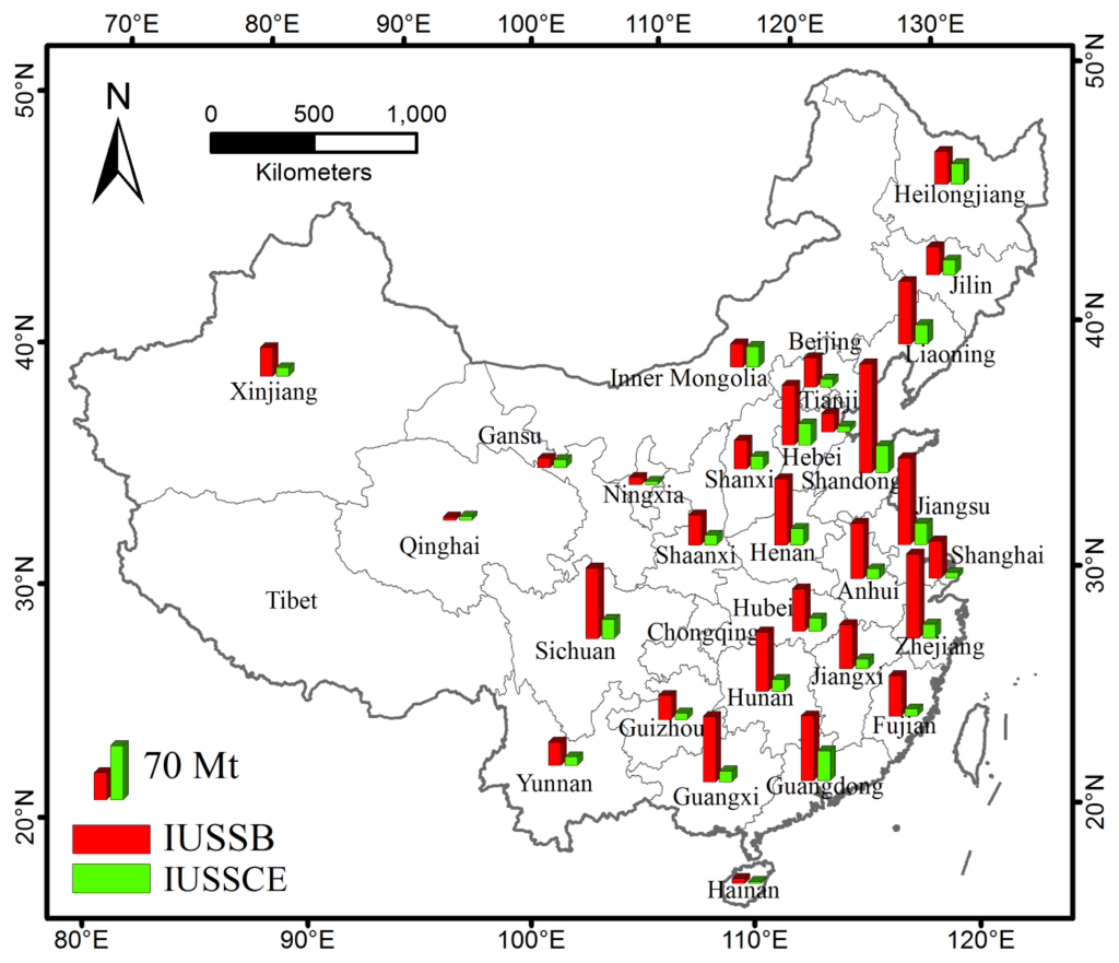 Distribution of provincial IUSSB and IUSSCE for mainland China in 2008.