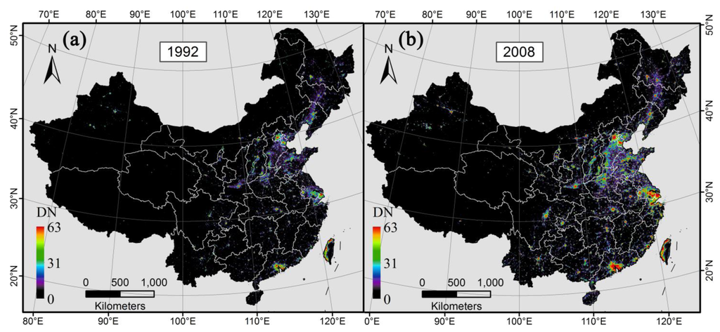 Spatial distribution of DMSP/OLS nighttime lights in China in (a) 1992 and (b) 2008.