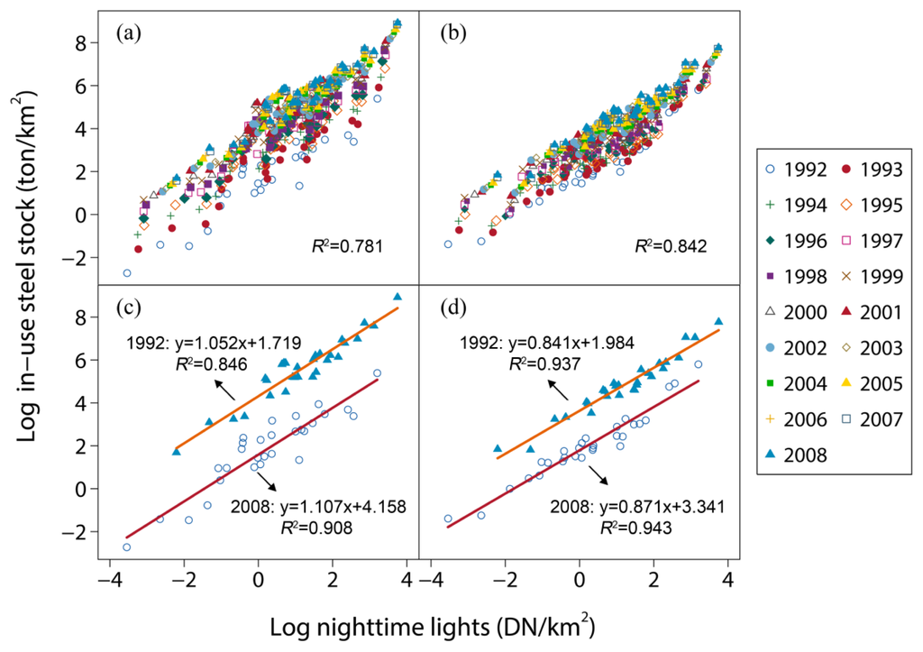 In our study, nighttime lights and in-use steel stock (specific to IUSSB or IUSSCE) over 17 years (1992–2008) for 29 provinces in China were combined as one panel data, which contains two dimensions: time-series dimension and cross-sectional dimension. For each dimension, LS estimators were conducted between the nighttime lights versus IUSSB and IUSSCE based on Equation (2), and the log-linear correlation was evaluated by the determination coefficient (R2) and root mean square error (RMSE). The cross-sectional regression was used to analyze the linear relationship between provincial in-use steel stock and nighttime lights for a specific year, whereas the time-series regression focused on the linear relationship between the long-term in-use steel stock and the nighttime lights for a specific province.
