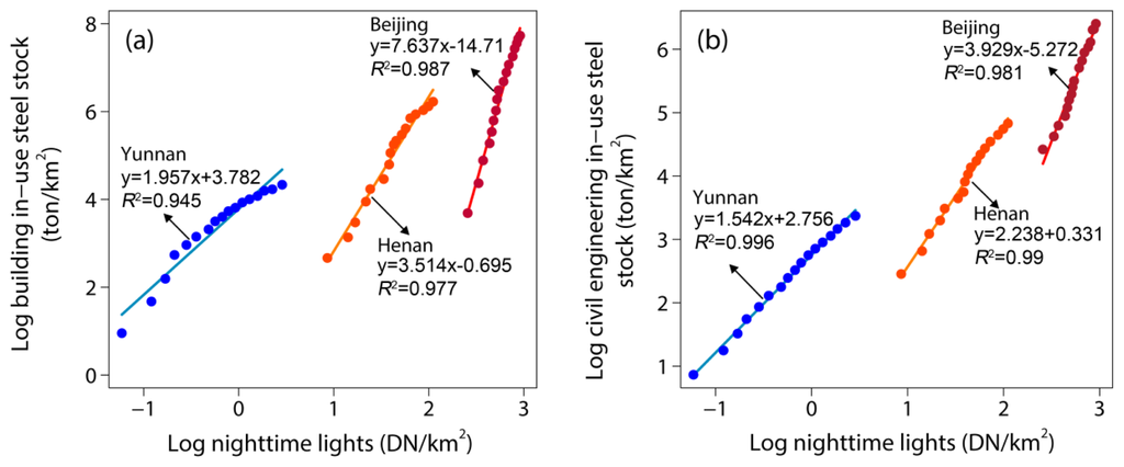 In this study, modeling of provincial in-use steel stock of buildings (IUSSB) and civil engineering infrastructure (IUSSCE) in China using the Defense Meteorological Satellite Program’s Operational Linescan System (DMSP/OLS) Nighttime Light Time Series (Version 4) products was investigated based on a long-term dataset (1992–2008). We found that the log-linear relationship between in-use steel stock and nighttime lights varied with time, showing slope ranges of 0.988–1.117 and 0.739–0.831, and intercept ranges of 1.719–4.182 and 1.984–3.358 for IUSSB and IUSSE, respectively. Meanwhile, the log-linear relationship also showed provincial differences with slope ranges of 1.917–7.637 and 1.422–3.929, and intercept ranges of −14.71–7.396 and −5.272–5.464 for IUSSB and IUSSE, respectively. These findings indicate that it is not appropriate to use a sole least square (LS) regression model for estimation of long-term in-use steel stock in China.