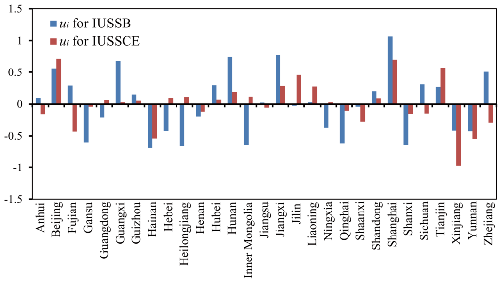are used to reduce the inter-provincial differences in the panel regression. For instance, ui is higher in Beijing and Shanghai than in the other provinces, suggesting that if a uniform LS model is used without consideration of their inter-provincial differences, the in-use steel stocks in Beijing and Shanghai will be underestimated. Conversely, the relatively low ui in Xinjiang, Hainan, and Yunnan indicated that the in-use steel stock will be overestimated using a uniform LS model. By adding ui for each province in the panel regression model, the overestimation and underestimation of the LS model can be effectively compensated.