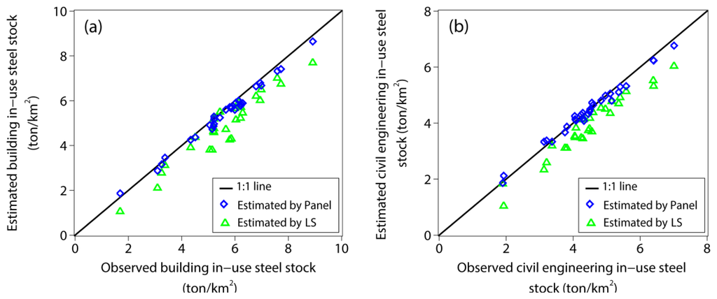 in 2008 were projected to be 2.768 and 1.636, respectively. Figure 8 shows scatter plots between the estimated versus the observed IUSSB and IUSSCE for 29 provinces. Although the estimated values of the LS models were linearly correlated with statistical data for both IUSSB and IUSSCE with R2 of 0.908 and 0.943, respectively, both IUSSB and IUSSCE were clearly underestimated by the LS models with RMSE of 0.855 and 0.624, respectively. This is probably because the temporal and inter-provincial effects on the relationship between in-use steel stock and nighttime lights were neglected. The panel regression models showed good estimations for both IUSSB and IUSSCE; all the data were around the 1:1 lines with R2 of 0.992 and 0.987 and RMSE of 0.238 and 0.154, respectively. These results indicate that the panel regression models are time-robust in deriving IUSSB and IUSSCE from nighttime lights at a nationwide scale in China.