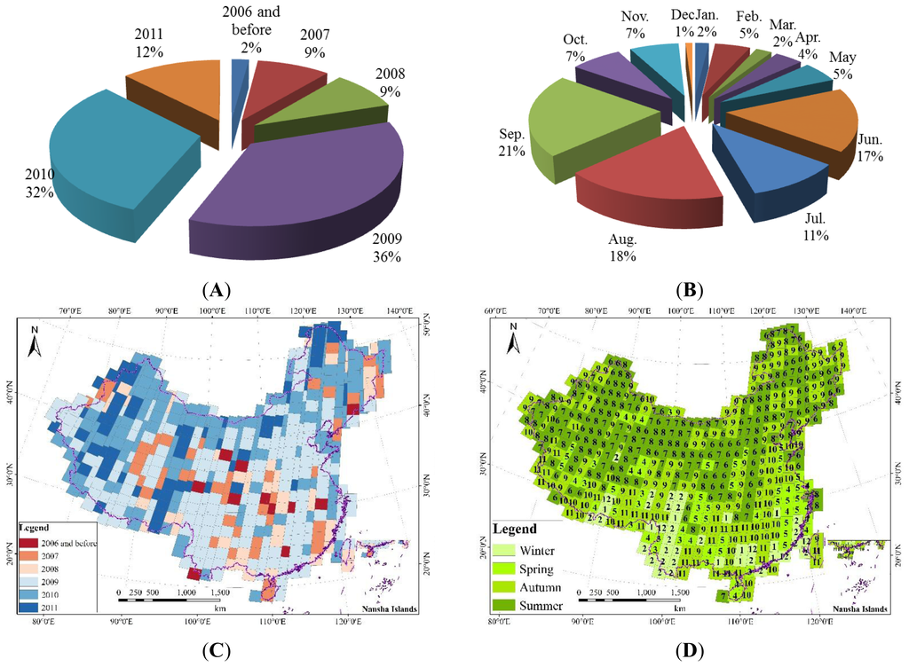 We collected 520 Landsat TM scenes from United States Geological Survey (USGS) Earth Resources Observation and Science (EROS) data center [] and Center for Earth Observation and Digital Earth []. Scenes with fewer clouds obtained in the growing season were selected (Figure 1) covering a time span from 2005 and 2011 with 98% of them acquired after 2007 (Figure 1A). These images were the best that we could collect from those data sources after 2006 based on seasonality and low cloud cover criteria. As a result, only 8% of the images were obtained in winter, but they were mainly distributed in the subtropical regions (Figure 1B,D). The images acquired in spring were mainly distributed in the South and some non-forest areas in the west (Figure 1D). The deciduous forests in these regions get green in April. Although many images were acquired in autumn, they are mostly in September and October (Figure 1B). The deciduous forests in the Northeast begin losing their leaves the earliest in China. The images in these regions are mainly obtained in September, before the leaf-falling stage. The images acquired in November are mainly distributed in the regions where evergreen forests or no forests grow (Figure 1D). Thus, forest land cover was only minimally affected by phenological differences. All Landsat TM/ETM+ images were calibrated and atmospherically corrected using the Global Mapper (GM) software, which implements an automatic Fast Line-of-Sight Atmospheric Analysis of Spectral Hypercubes (FLAASH) algorithm [].