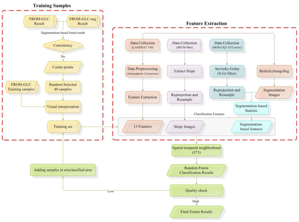 The forest mapping effort involved two main parts (Figure 2), forest/non-forest classification and more specific forest type classification. For the forest/non-forest classification, there were three main steps. First, numerous features in support of forest identification were calculated from TM, MODIS, and the DEM. Second, training samples for forest and other vegetation cover types (i.e., Cropland, Grassland, Shrubland) were collected and refined. Finally, an advanced machine learning algorithm—Random Forest was used, followed by quality checking and refinement.