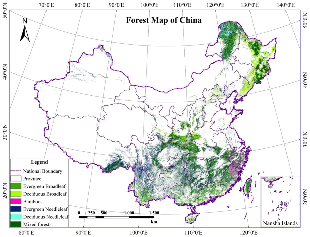 Remote sensing is an important tool for monitoring environmental changes []. Liu et al. [] developed land use maps for China by manual interpretation of Landsat TM and Enhanced TM plus (ETM+) imagery. In their map, 3 forest types were included, i.e., “Forest Land”, “Open Forest Land”, “Other Forest Land”. Zhang et al. [] generated a Chinese land cover map for 2005 using a human-computer interaction method based on Landsat TM and China Brazil Earth Resources Satellite (CBERS) data and classified “Forest Land” from a land-cover perspective. Hu et al. [] produced a 30 m land cover map of China by applying an efficient image clustering technique to Landsat TM data. Human-computer interaction is time- and labor-consuming and difficult to reproduce. In addition, the accuracy depends on the knowledge of interpreters. In recent years, more openly available remotely sensed data and new classification algorithms [,] have made it possible to map forests at large spatial scales more consistently and efficiently.