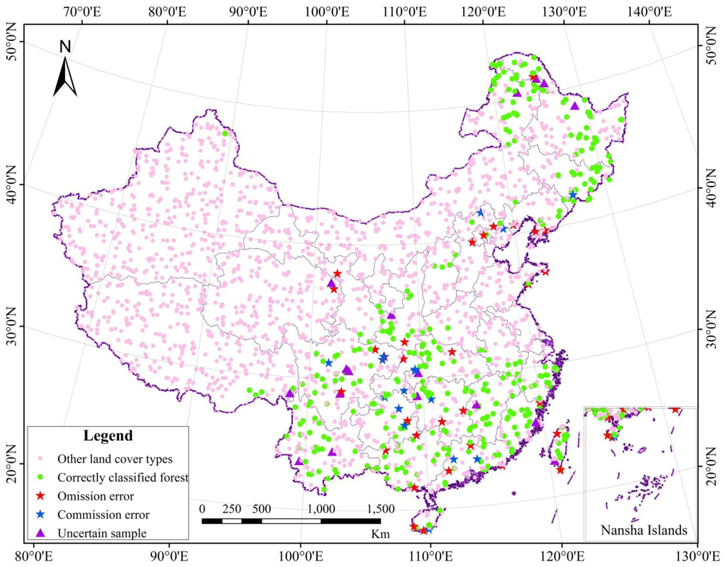 Figure 4 shows that most of the errors (omission and commission) are happening in the central region of Southern China, Hebei and Liaoning Provinces. For the central region of Southern China, many images are contaminated by clouds or haze. As a result, the uncertainty of classification increases in these areas. For Hebei and Liaoning Provinces, forests are mixed with shrubs. Their spectral information is similar and difficult to separate. Also, large areas of orchard in these regions increase the classification difficulty.