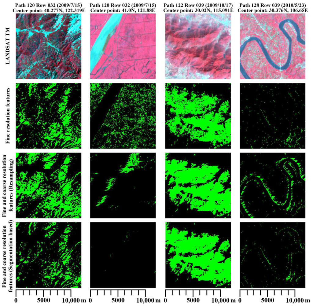 We used thirteen 30 m resolution features, one 90 m resolution feature and eighteen 250 m resolution features as inputs to this forest mapping. A segmentation-based method was applied to combine those multi-resolution features. We averaged EVI values in the same segment. The advantage of this method is that it combines the spectral, spatial information of the TM images and ensures homogeneity of land cover types in the same segment. By so doing, the influences of the coarse resolution images at the edges of the land cover patches have been reduced. Figure 5 shows the influences of different resolution on the classification results where fine resolution features stand for classification results obtained by using the thirteen 30 m resolution features and the 90 m resolution feature. We compared two TM/MODIS combination methods, resampling of MODIS down to TM scale and segmentation-based methods. It can be seen that the classification results based on the segmentation method are constrained by the TM data. They show more details at the edges of land cover types than the resampling method (Path 128 Row 039). Combining TM and MODIS using a resampling method may produce poorer results than using TM features alone (Path 120 Row 032, Path 128 Row 039). Including MODIS features using segmentation method could improve the results without loss of resolution when the land cover types are not separable with TM features only (Path 120 Row 032), or the TM images are contaminated by fog (Path 122 Row 039).