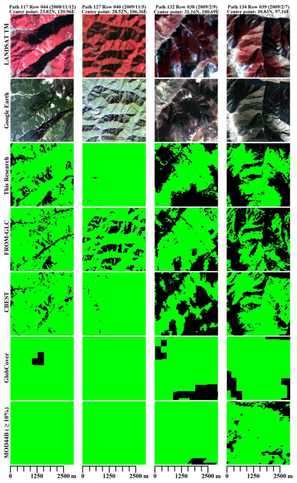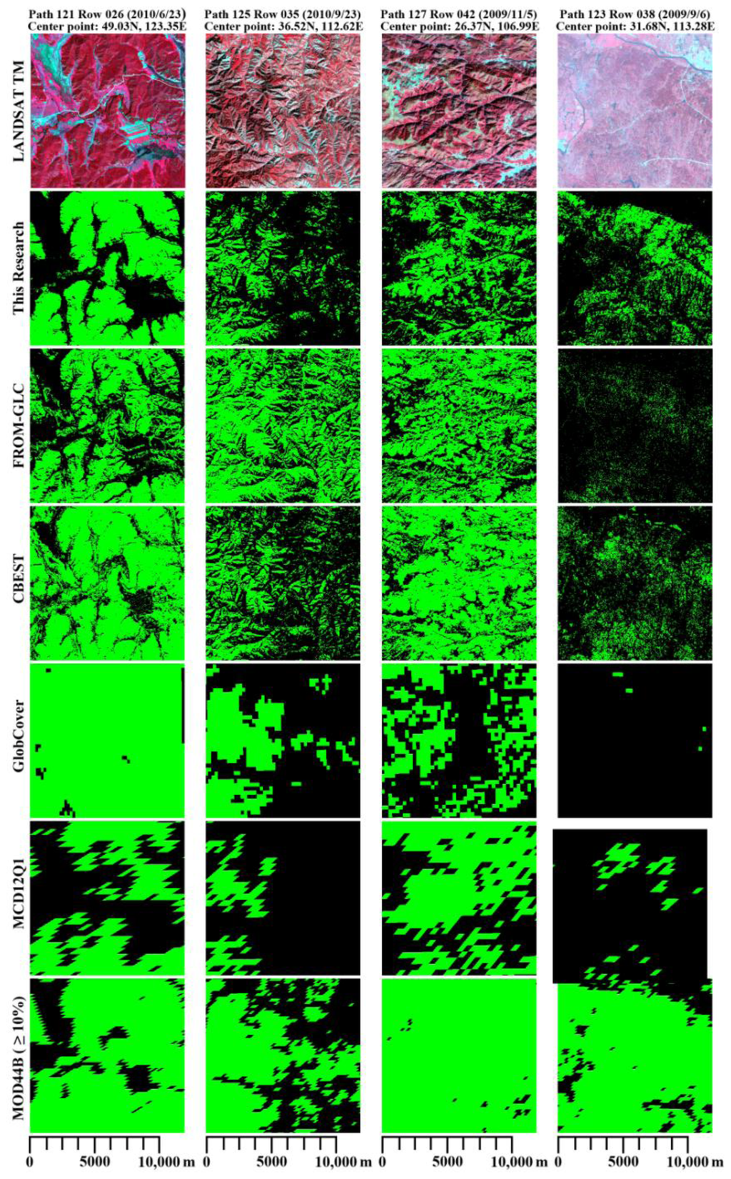 Figure 6 compares the forest extent results with other forest products mentioned in the introduction. As MOD44B provides percentage of tree cover, we assign the pixels with more than 10 percent as forest in this comparison. Because of the coarse resolution, forest extent from Globcover, MCD12Q1 and MOD44B show less detail. We obtained improved forest mapping results by reducing the confusion of forest cover with grass (path 121 row 026), with farmland (path 125 row 035) and with shrubs (path 127 row 042). In these regions, the commission errors are large in most of the other products. The results presented here are less affected by contamination of fog (path 123 row 38). Our results preserved more details of the forest distribution with less obvious misclassifications.