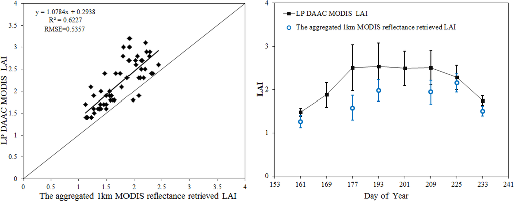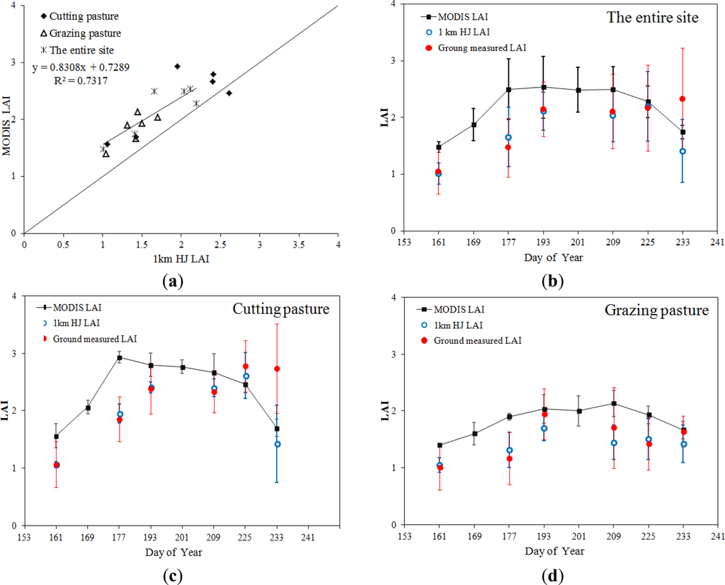 In terms of the uncertainty of the HJ-retrieved LAI maps, temporal discrepancies between the MODIS 8-day composite LAI product and LAI data acquisition campaigns may have affected the comparison results to some extent with respect to the applicability of our HJ-retrieved LAI maps to evaluate the MODIS LAI products, especially during the large variation of grass period (fast growth or withering) at the beginning and end of the growing season.