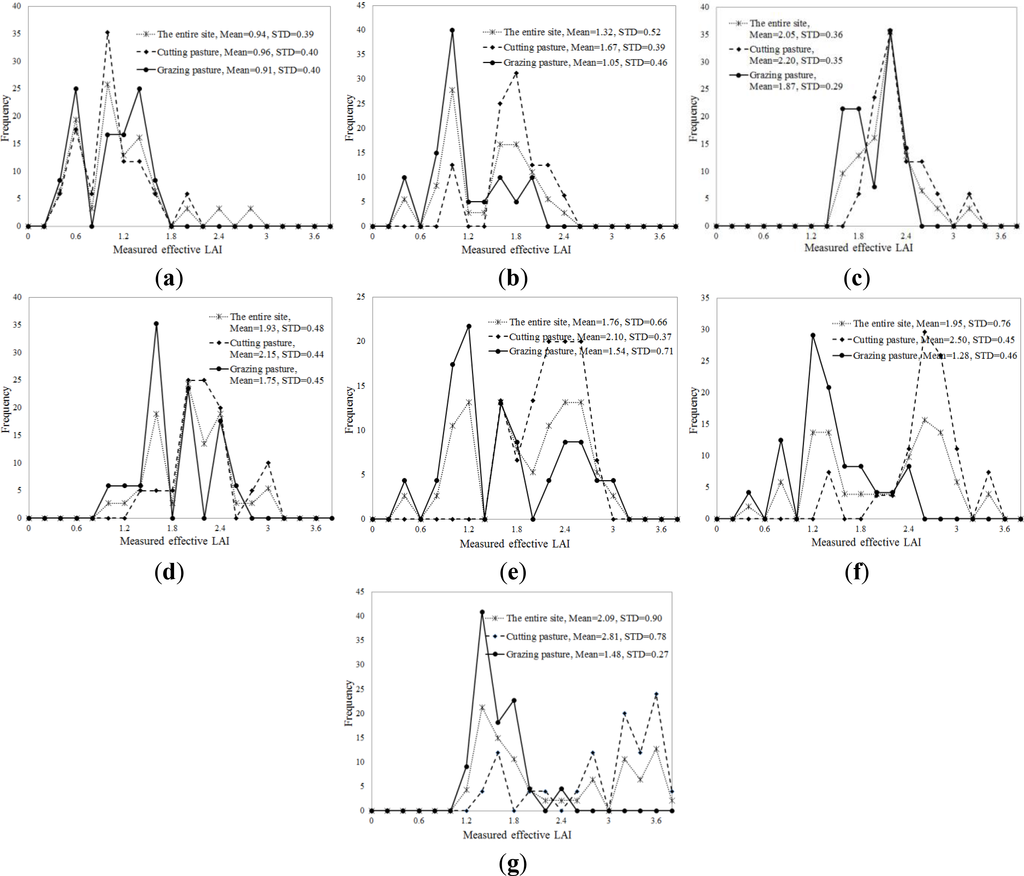 Histograms, mean LAI values, and standard deviations were used to determine the uncertainty of in situ-measured effective LAI values. Figure 3 presents the histograms of the field-measured effective LAI values for the entire site, the cutting pasture and the grazing pasture which were collected during every field campaign; good results are observed. The distribution of the measured LAI values for most dates forms an approximately normal distribution; the standard deviation is relatively small compared with the mean LAI values. Generally, the mean effective LAI values for the site were 0.9–2.5 m2/m2 during the growing season. For the cutting pasture, the maximum LAI value was 2.81 m2/m2 (standard deviation of 0.78 m2/m2), which occurred in the later stage of grass growth (19 August). The maximum LAI value for the grazing pasture was 1.81 m2/m2 (standard deviation of 0.29 m2/m2), which occurred on 6 July. During the peak of the growing season, the mean LAI value remained at 1.9–2.1 m2/m2 over entire site. On 19 August the standard deviation of the cutting pasture is 0.78 m2/m2, which was larger than the values of the other dates. This result was due to the grass cutting activity that occurred in this pasture.