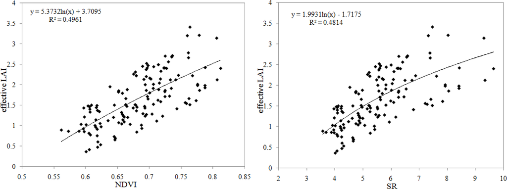 An empirical regression approach was employed to retrieve the effective LAI maps. Wang et al. [28] reported that empirical approaches worked well to produce a fine-resolution LAI map because the regression processes could find the best fit between the regressed variables and eliminate the problem of systematic bias at a specific site. Various vegetation indices are widely used and tested to regress ground-measured LAI, such as the Normalized Differential Vegetation Index (NDVI), Simple Ratio (SR) and Reduced Simple Ratio (RSR) [25,46,47]. Owing to the lack of a shortwave infrared reflectance channel in the HJ sensors, the RSR was not used in this study. Due to the radiation differences and geolocation errors within and between images, we used the field LAI data and field spectrum collected from in situ campaigns to build the regression model. Moreover, Chen et al. [25] found that an algorithm developed from multiple scenes is more reliable than that developed from only one scene due to the small dynamic range of the LAI and the insufficient number of data points in a single scene.
