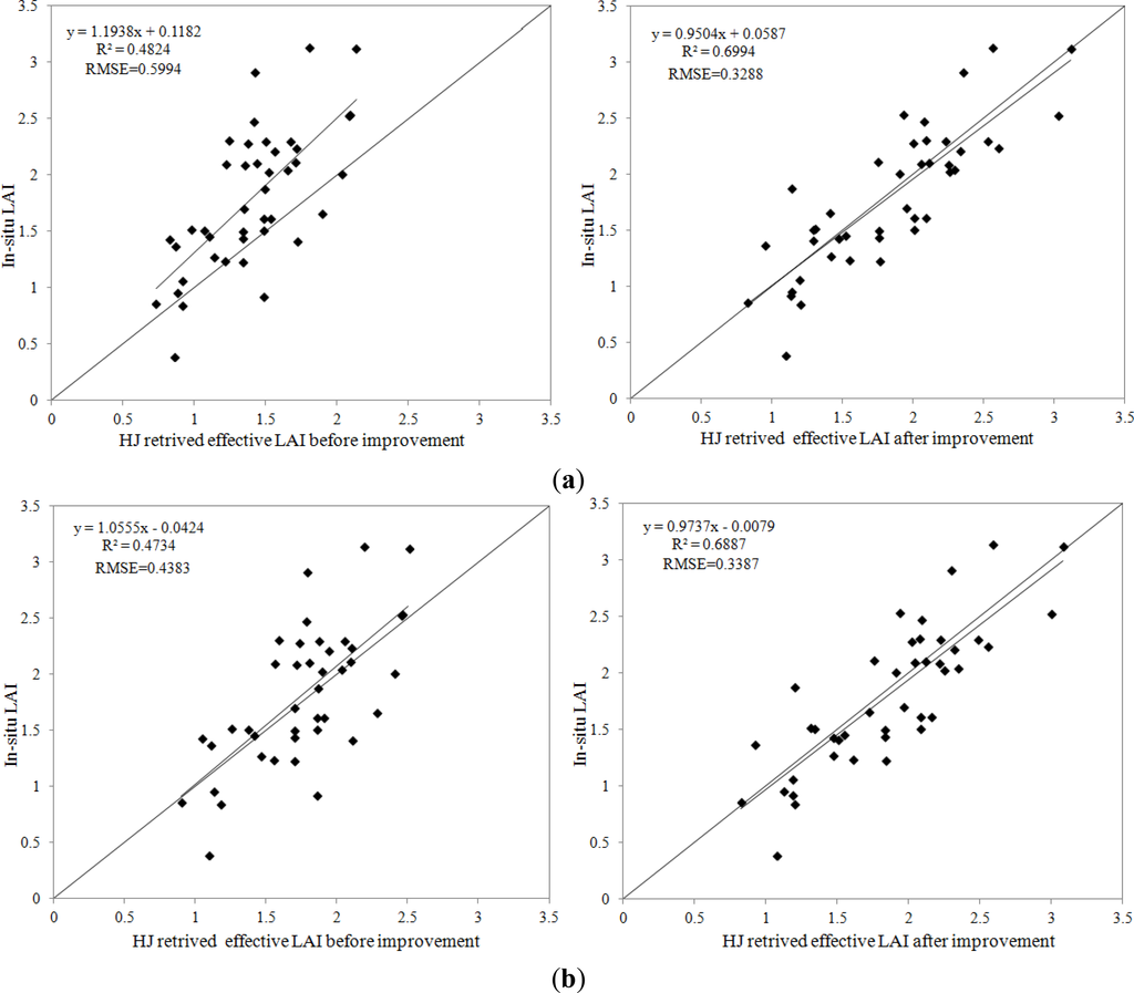 Validation of the HJ-retrieved effective LAI maps before (left panel) and after (right panel) improvement. (a) Validation of the HJ-retrieved effective LAI maps before and after improvement using the LAI-NDVI model. (b) Validation of the HJ-retrieved effective LAI maps before and after improvement using the LAI-SR model.