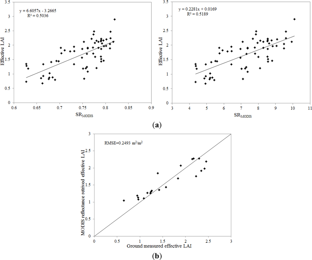 Relationships between ground effective LAI and MODIS reflectance generated vegetation indices, and validation of retrieved LAI maps. (a) Relationships between ground effective LAI and NDVIMODIS (left) and LAI-SRMODIS (right). (b) Validation of retrieved LAI maps derived from LAI-SRMODIS model.