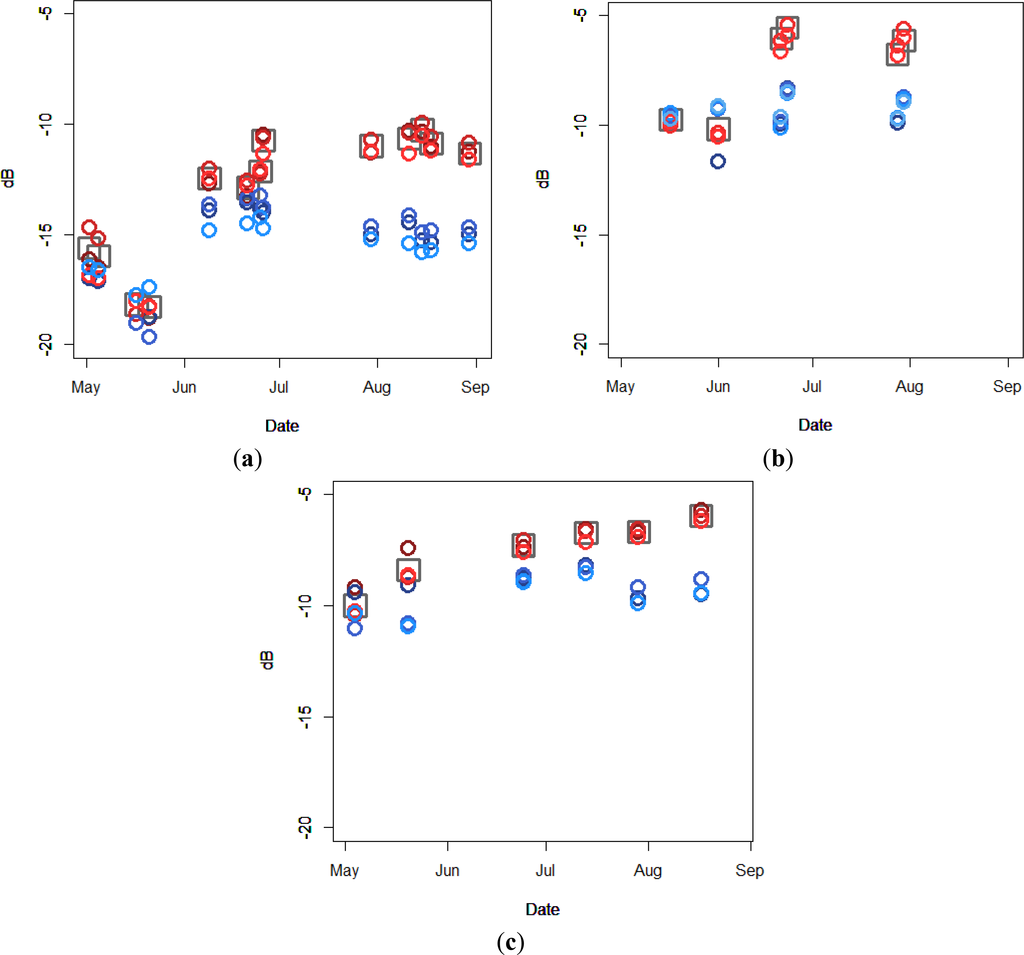 - Kasischke, E.S.; Morrissey, L.; Way, J.; French, N.H.F.; Bourgeau-Chavez, L.L.; Rignot, E.; Stearn, J.A.; Livingston, G.P. Monitoring seasonal variations in boreal ecosystems using multitemporal spaceborne SAR data. Can. J. Remote Sens 1995, 21, 96–109. [Google Scholar]