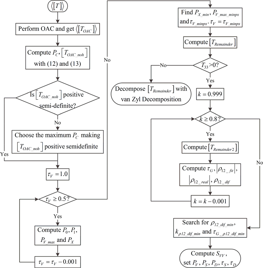 However, PC given in Equation (12) cannot always guarantee [TOAC_noh] satisfy NNEC. Once [TOAC_noh] violates NNEC, PC is recomputed as the maximum value that makes [TOAC_noh] positive semidefinite. In this paper, T13 in [TOAC_noh] is ignored and treated to be zero because no scattering model could explain non-zero T13. Since, in most cases, [TOAC_noh] has T23 = 0, so [TOAC_noh] is reflection symmetric.