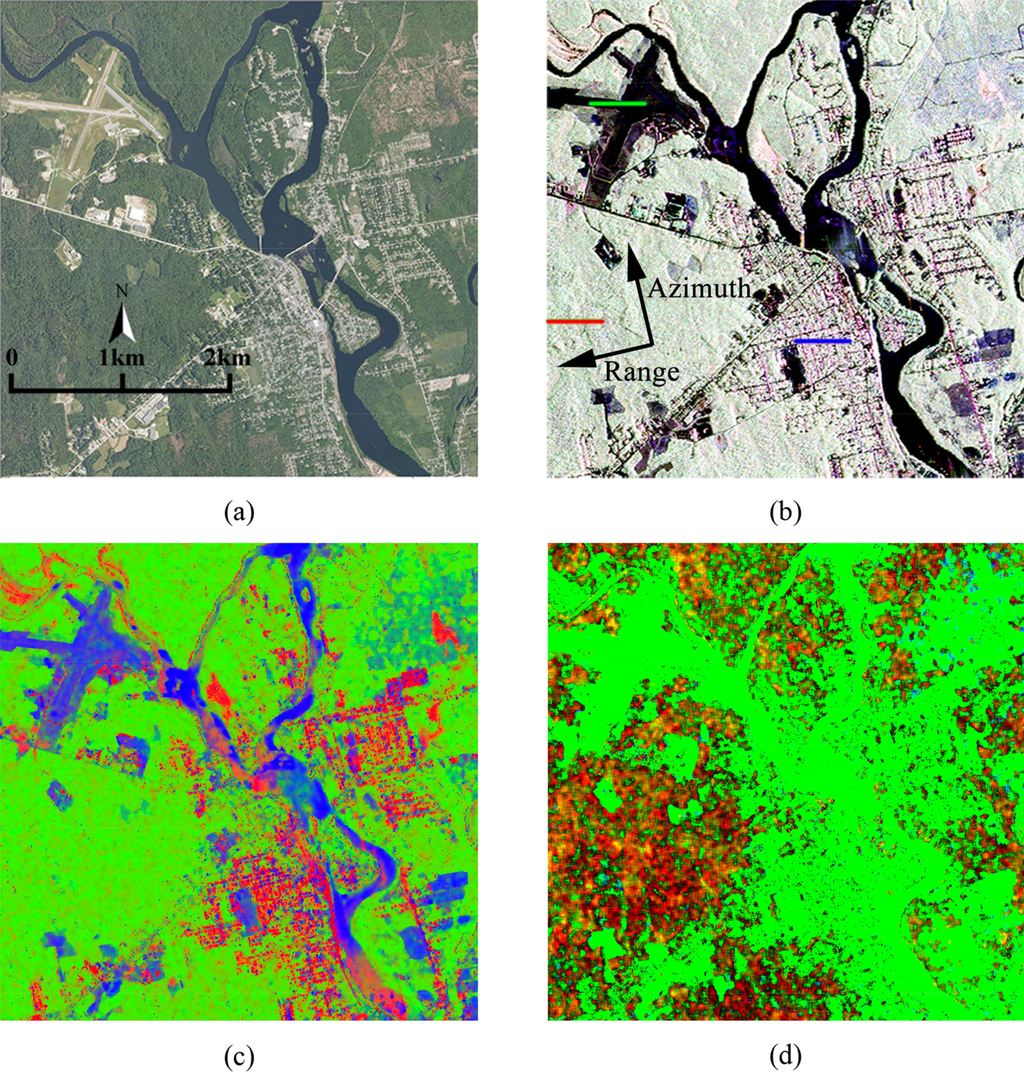 (a) Optical images from National Agriculture Imagery Program (short for NAIP and administered by USDA-FSA Aerial Photography Field Office) 2009; (b) Pauli color-coded image; (c) Image composed of different components power, red is for PD/Pspan, green is for PV/Pspan, and blue is for PS/Pspan; (d) Image composed of τ of different components, red is for τD, green is for τV, and blue is for τS. The geographic coordinate of image center is 68.656°W, 44.943°N.