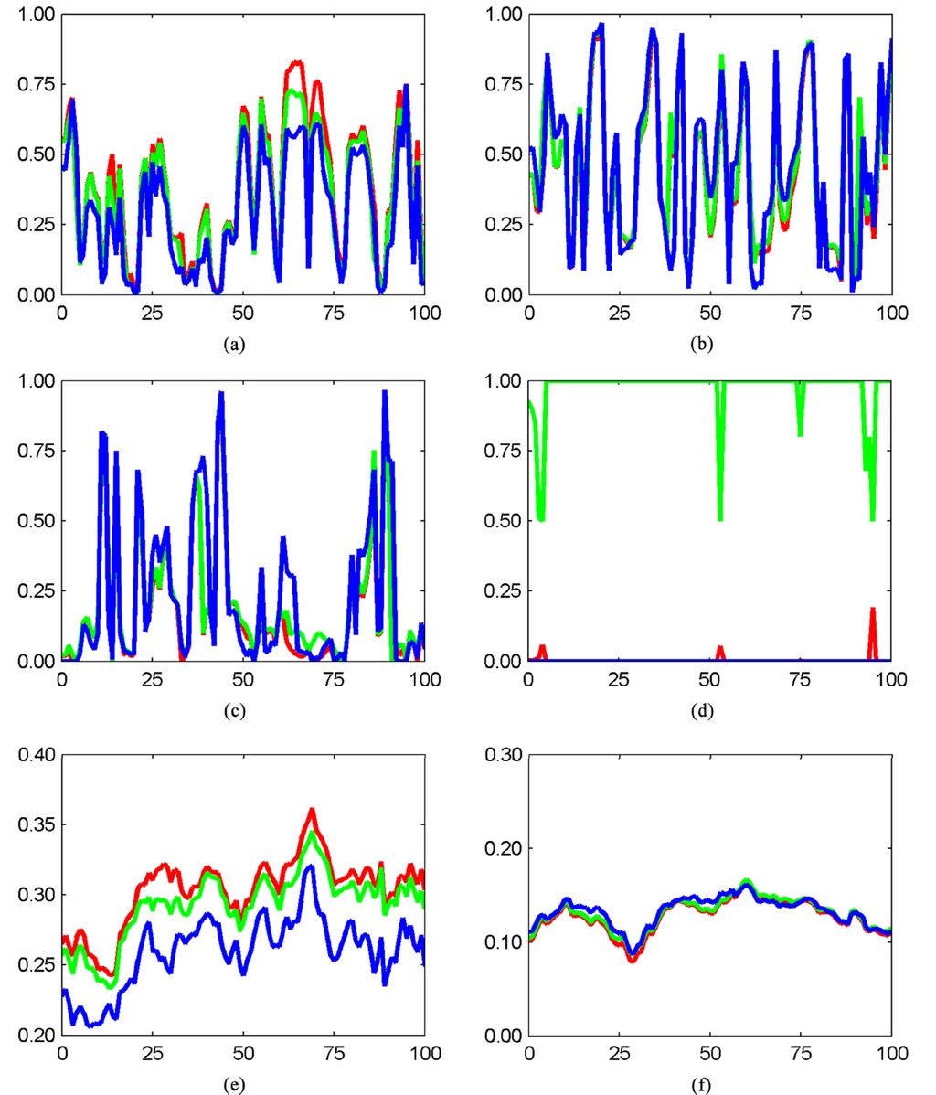 The results of the proposed decomposition were compared with these of van Zyl decomposition and the other three latest NNED raised by Cui et al. [12] and Wang et al. [13]. Two NNED were raised by Cui et al. [12] and they only differ in the decomposition of the remainder matrix, one is based on Eigen-decomposition, namely, Cui1, and the other on model fitting, namely, Cui2. It is found that the performance of Cui1 is not as good as Cui2 and Wang decomposition, while the results of Cui2 and Wang decomposition are quite similar. To avoid five profiles existing in one plot so the readers are confused, Figure 4 only gives the profiles of Wang, van Zyl and the proposed decomposition along three 500-m-long lines in Figure 3b. Red, green, and blue lines cover natural forests, airport, and urban areas, respectively.