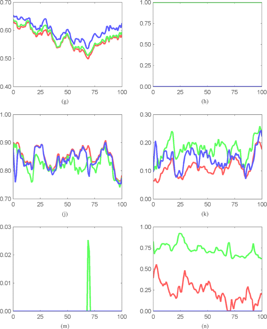Horizontal axis is pixel’s relative position along profile. (a–d) are the profiles along the blue lines in Figure 3b; (e–h) are the profiles along the green lines in Figure 3b; (j–n) are the profiles along the red lines in Figure 3b; (a,e,j) are the profiles of PV/Pspan; (b,f,k) are PD/Pspan; (c,g,m) are PS/Pspan. In above 9 subfigures, red lines are the results of van Zyl decomposition, green lines are the results of Wang, and blue lines are the results of the proposed method; (d,h,n) are the τ profiles along the blue, green, and red lines in Figure 3b, respectively. In (d,h,n), red line is τD, green line is τV, blue line is τS.